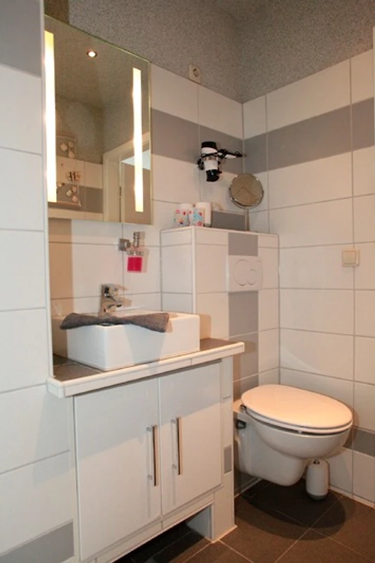 Im Badezimmer gibt es eine Überkopf-Regenschauerdusche mit Handbrause, Waschbecken, WC, eine Handtuchheizung, einen Föhn sowie genügend Ablageflächen.