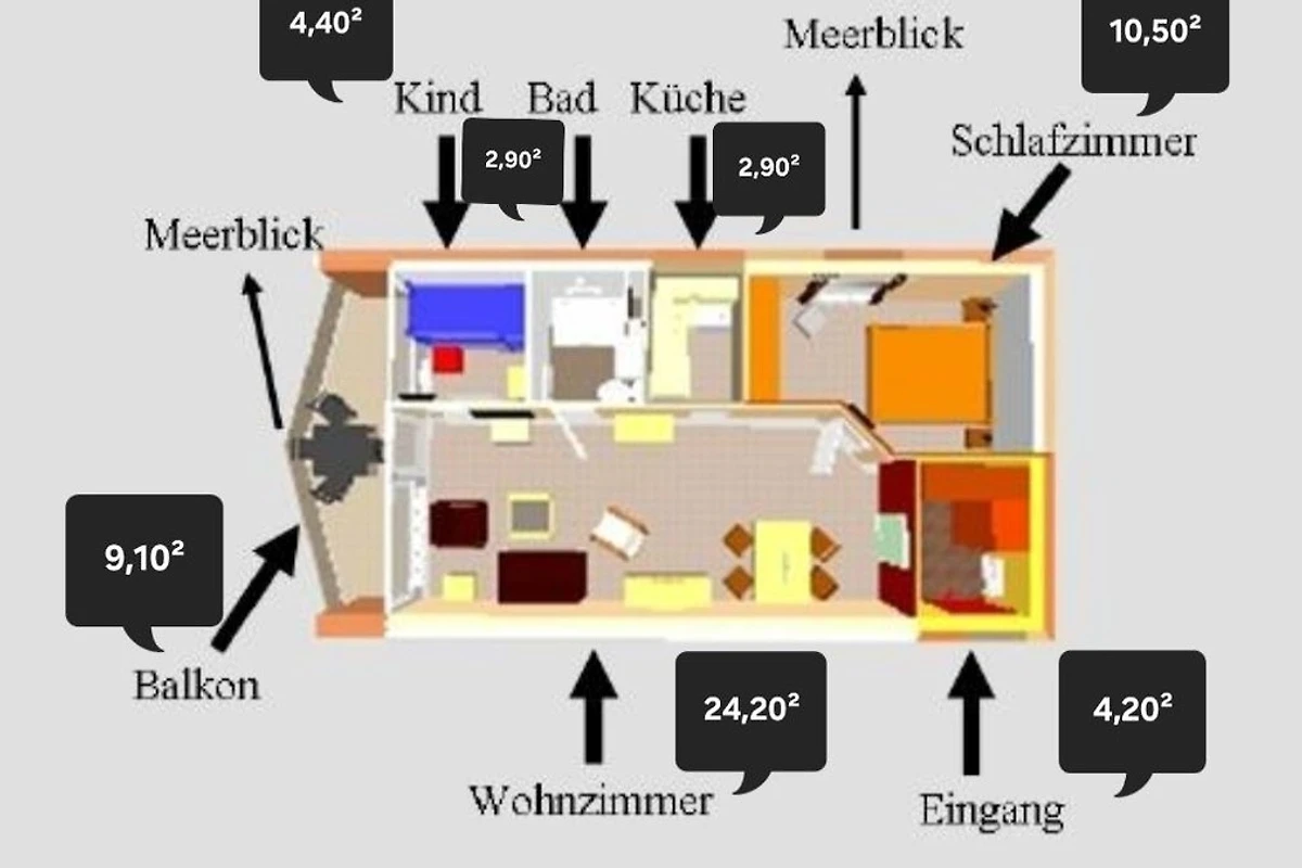 Vom Schlafzimmer haben sie einen wunderschönen Blick auf die Ostsee. Ein erhöhtes Doppelbett (200 x 180 cm) mit elektrisch verstellbaren Lattenrosten, ein geräumiger Kleiderschrank mit eingebautem Safe (nicht versichert) und ein Flachbildschirm gehören hier zur Einrichtung.