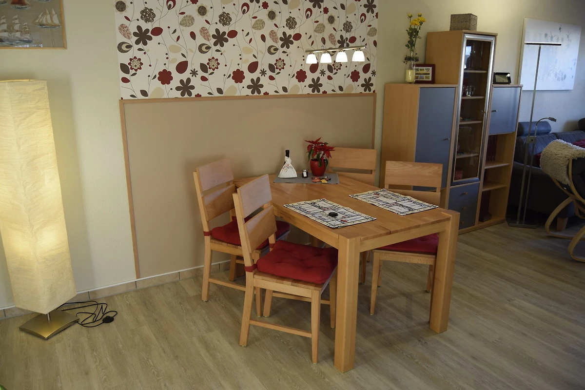 Im geräumigen Wohn- und Esszimmer haben sie genügend Platz. An dem grossen Esstisch können Sie nicht nur essen, sondern auch spannende Spieleabende verbringen. In der gemütlichen Sofaecke lässt es sich herrlich relaxen, lesen, Musik hören, DVDs sehen oder die eine oder andere Lieblingssendung im TV verfolgen. Über Internet sind Mediatheken und Netflix verfügbar. Telefon und schnelles W-LAN stehen ebenso kostenfrei zur Verfügung.
