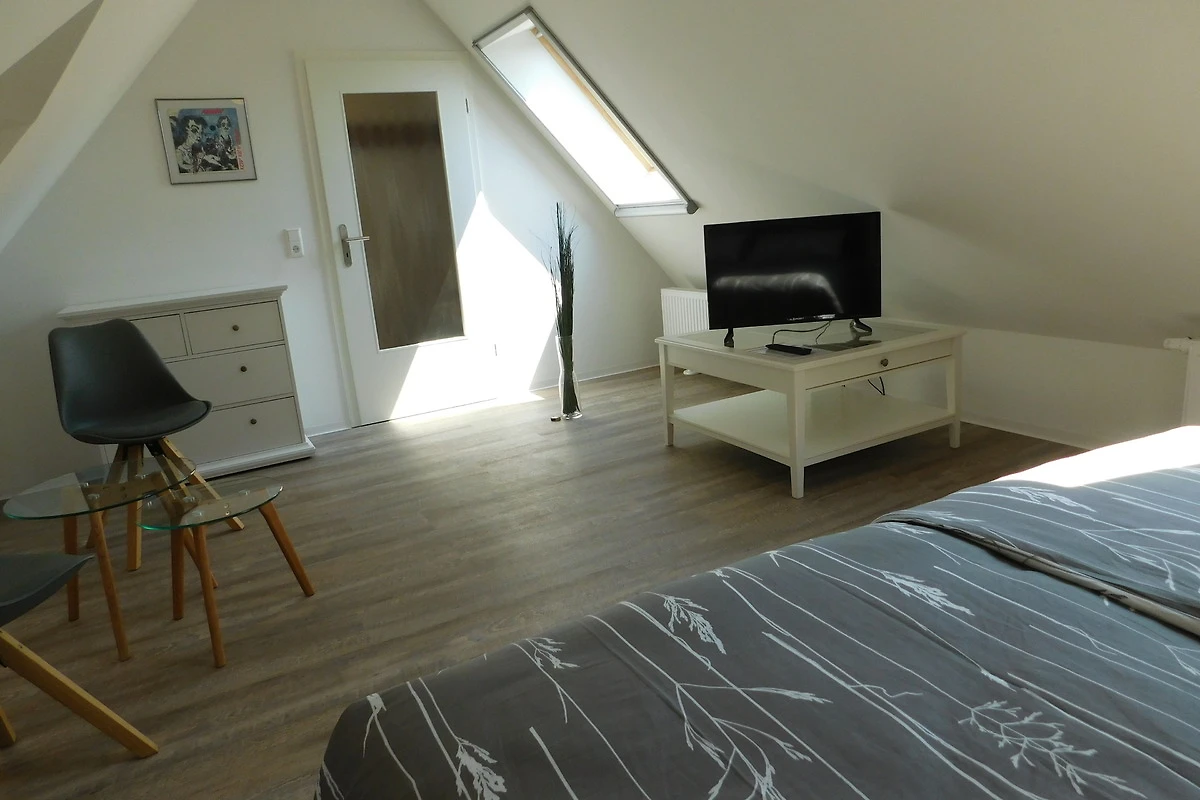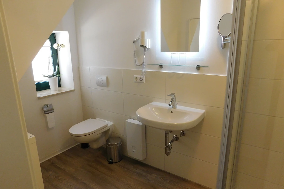 Das Bad ist mit einer ebenerdigen Dusche ausgestattet. Über eine bequeme kleine Treppe kommen Sie in das gemütliche Schlafzimmer im Dachgeschoss.