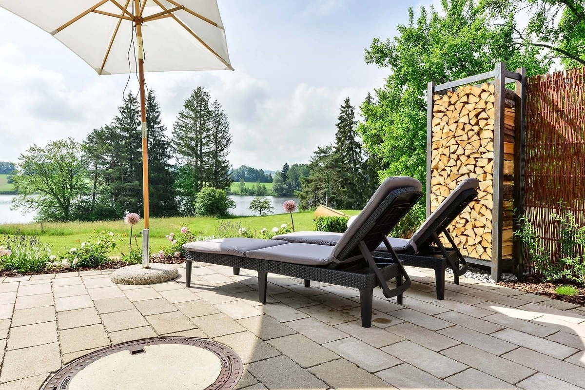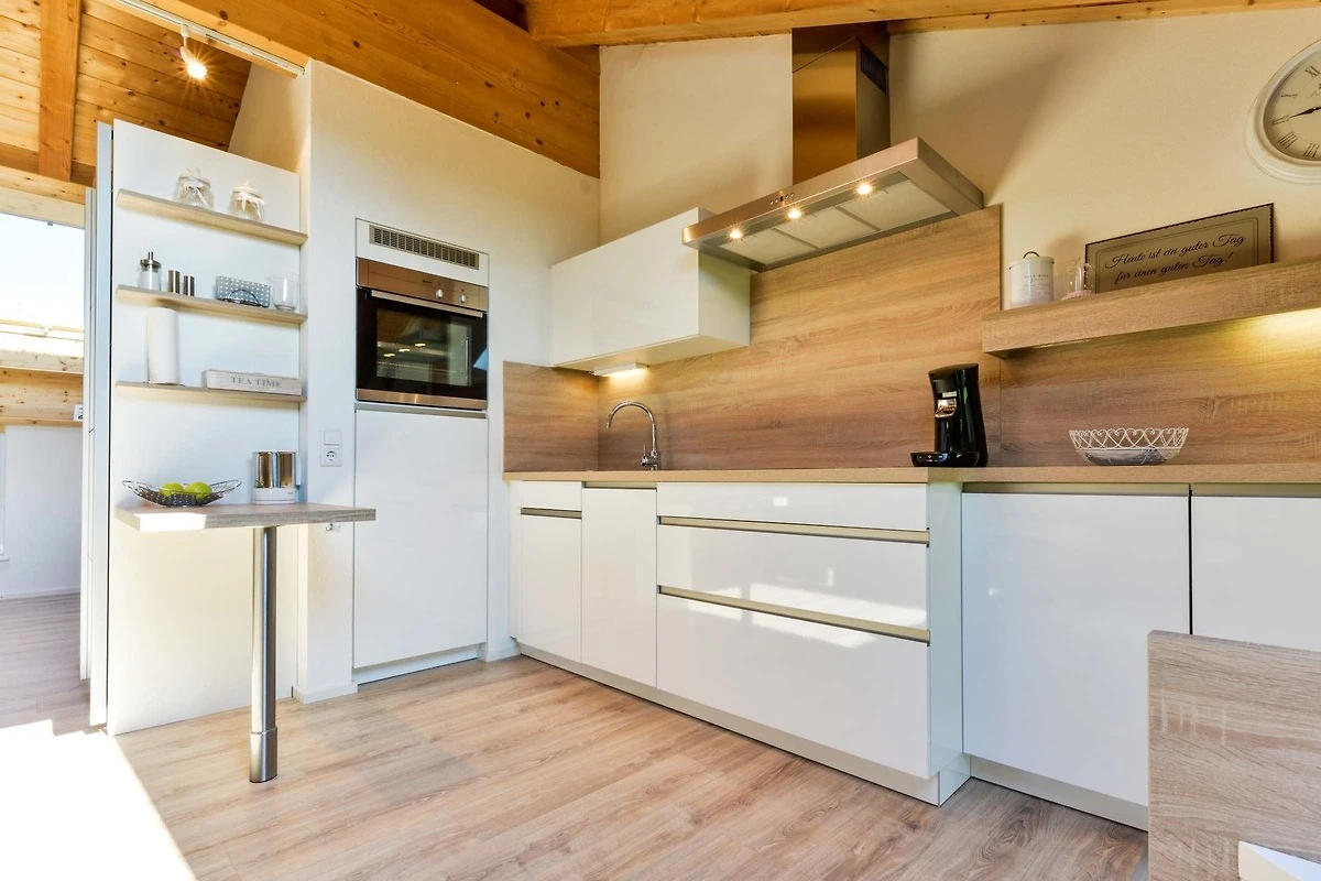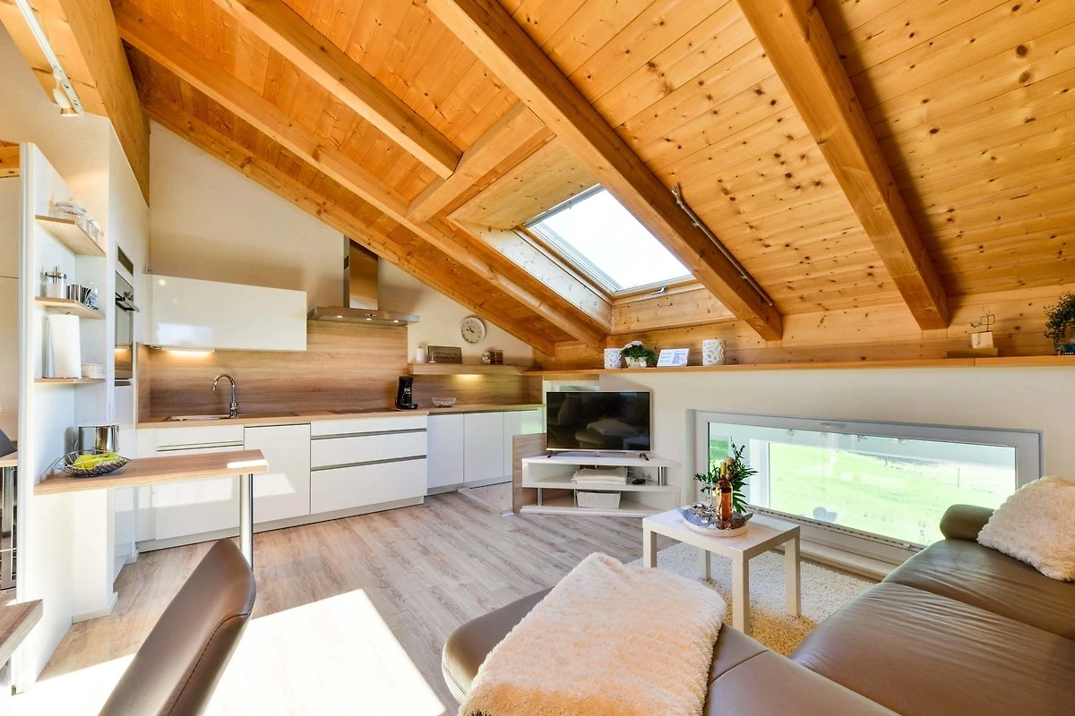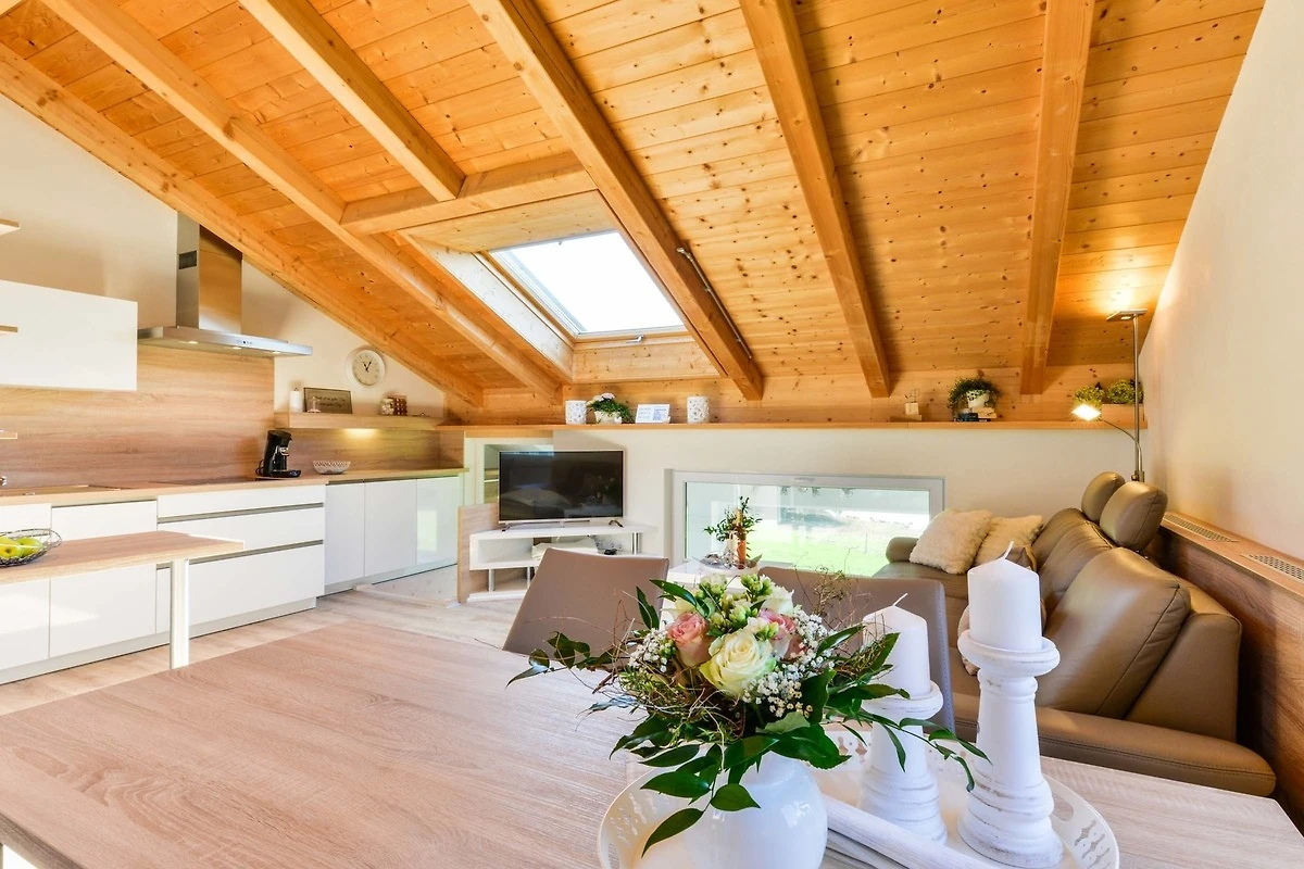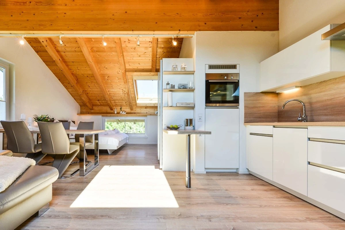 Gelegen im Obergeschoss des Nebengebäudes bieten die Wohnungen einen grossartigen Ausblick. Die idyllische Stimmung zwischen Wald und See bietet einzigartige Ruhe und Erholung. Die geschmackvoll gestaltete Ferienwohnung 2 verfügt über einen stilvoll kombinierten Wohn- und Essbereich. Die Wohnfläche besticht mit einer grossen, einladenden Couch. Der Esstisch mit lädt zum gemeinsamen Speisen ein. Der moderne Küchenbereich bietet eine freistehende Kochinsel. Ideal zum Zubereiten von Speisen und Snacks.