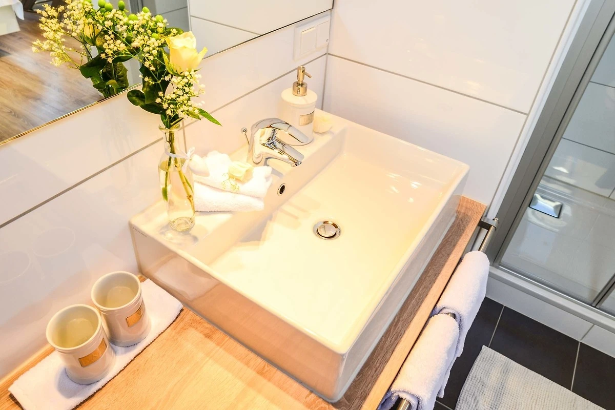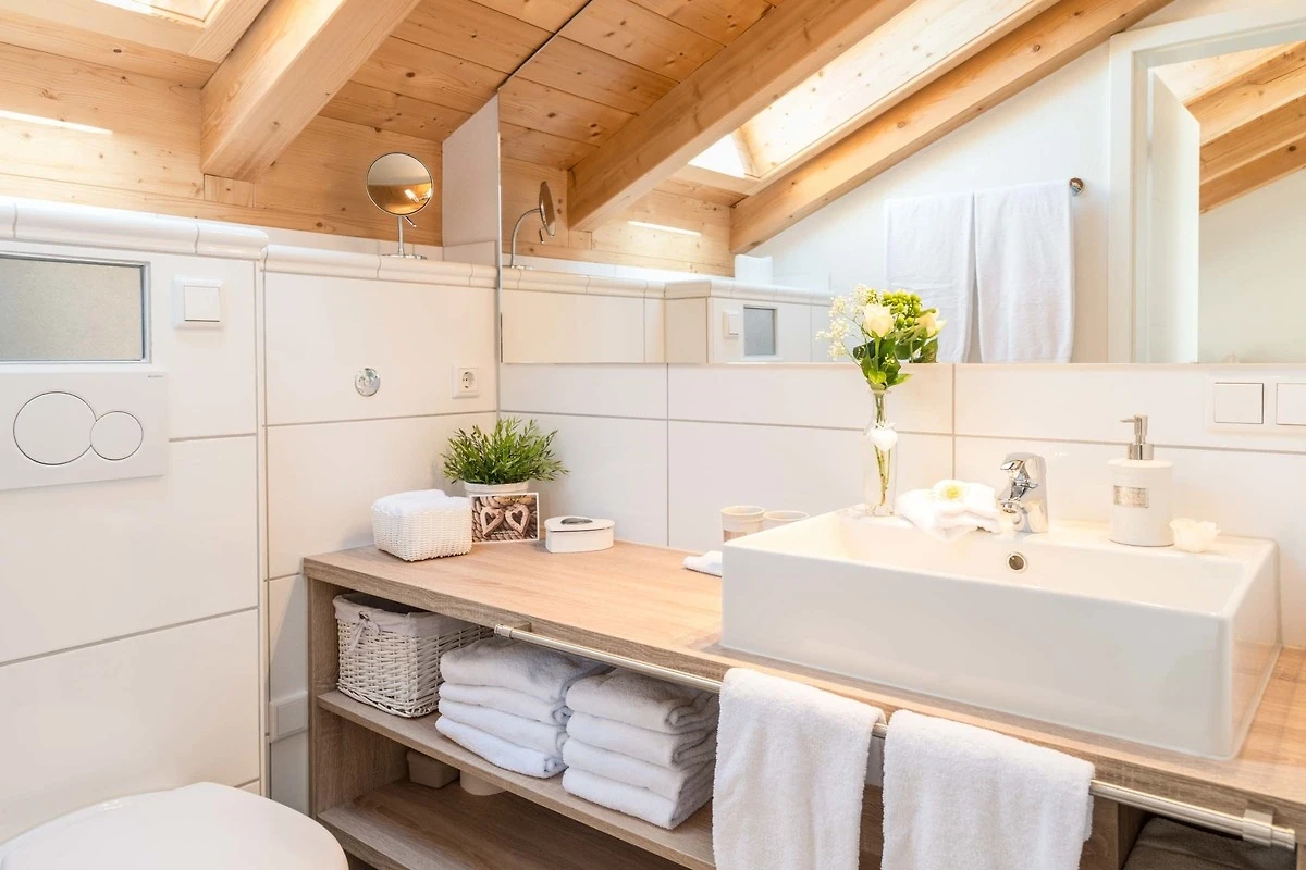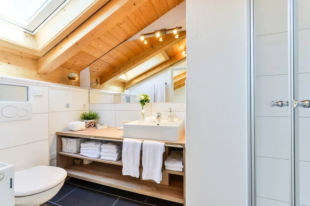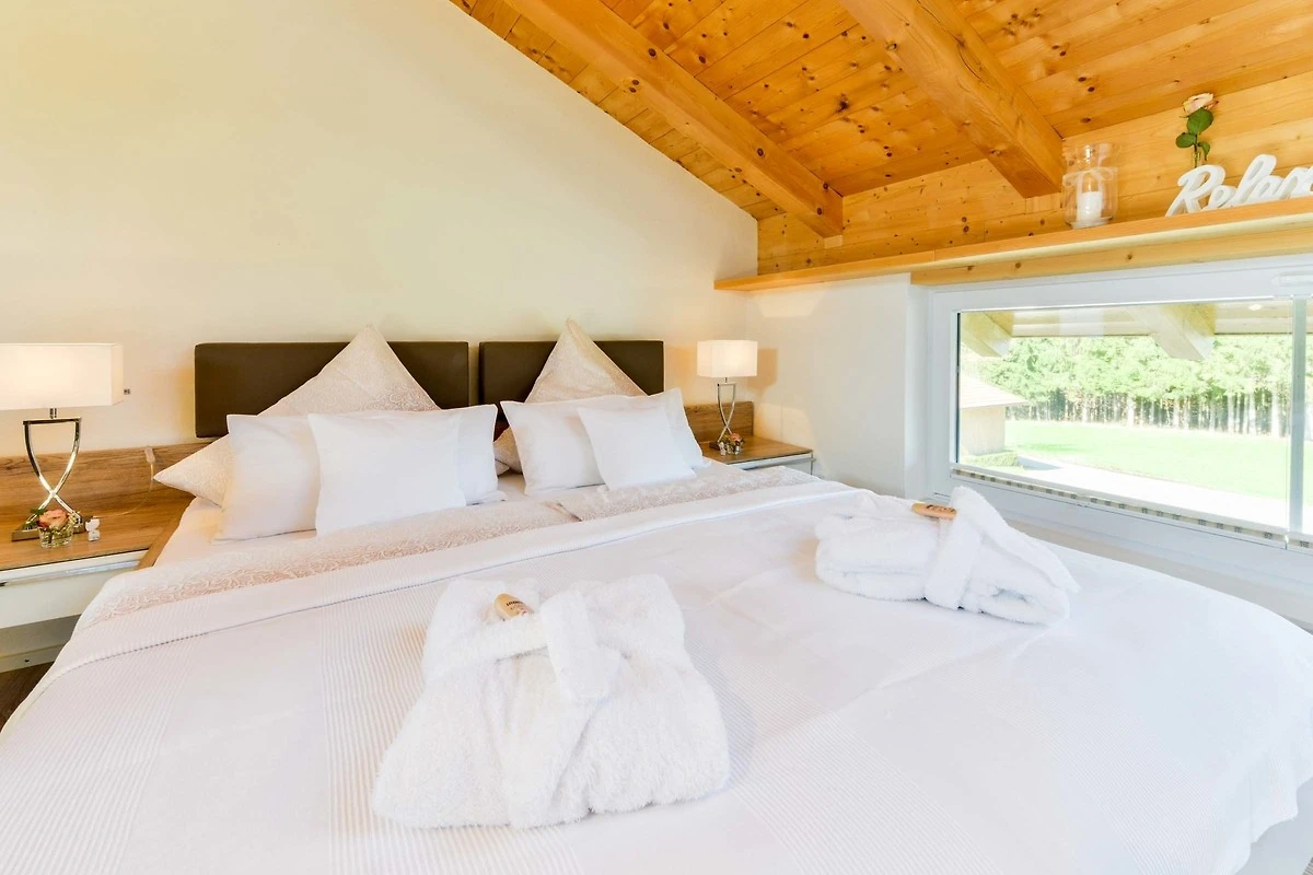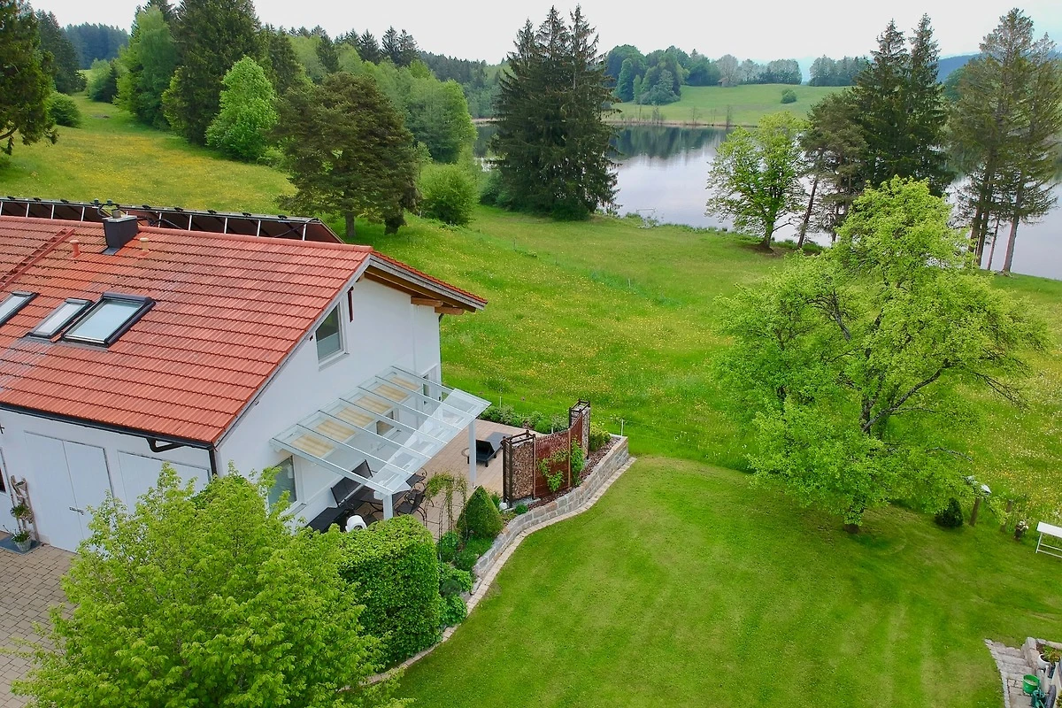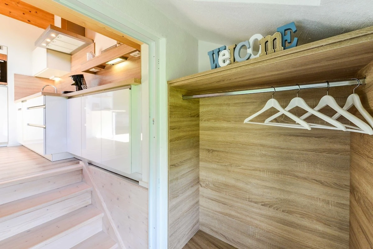Gelegen im Obergeschoss des Nebengebäudes bieten die Wohnungen einen grossartigen Ausblick. Die idyllische Stimmung zwischen Wald und See bietet einzigartige Ruhe und Erholung. Die geschmackvoll gestaltete Ferienwohnung 2 verfügt über einen stilvoll kombinierten Wohn- und Essbereich. Die Wohnfläche besticht mit einer grossen, einladenden Couch. Der Esstisch mit lädt zum gemeinsamen Speisen ein. Der moderne Küchenbereich bietet eine freistehende Kochinsel. Ideal zum Zubereiten von Speisen und Snacks.
