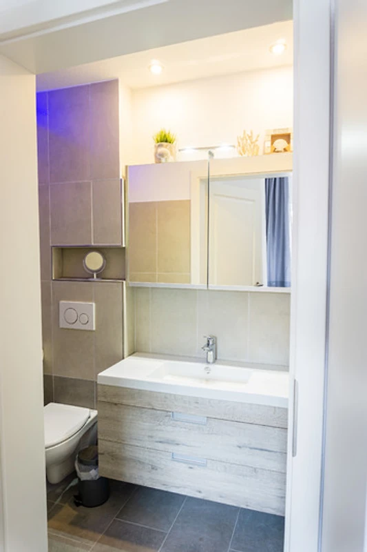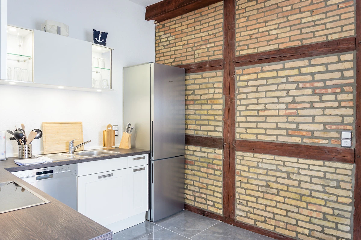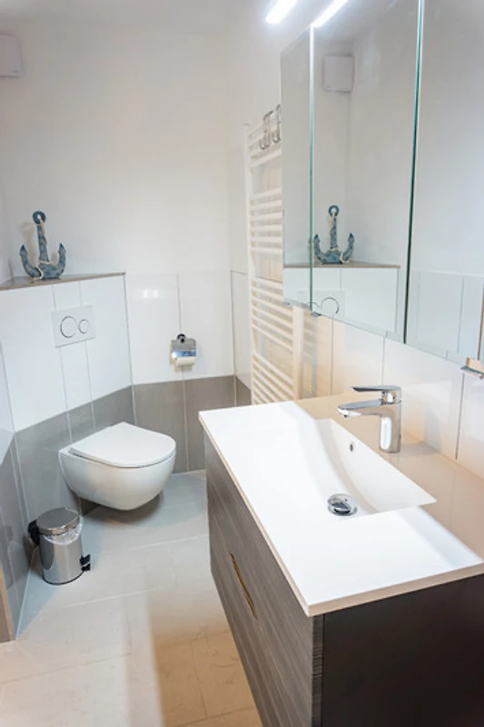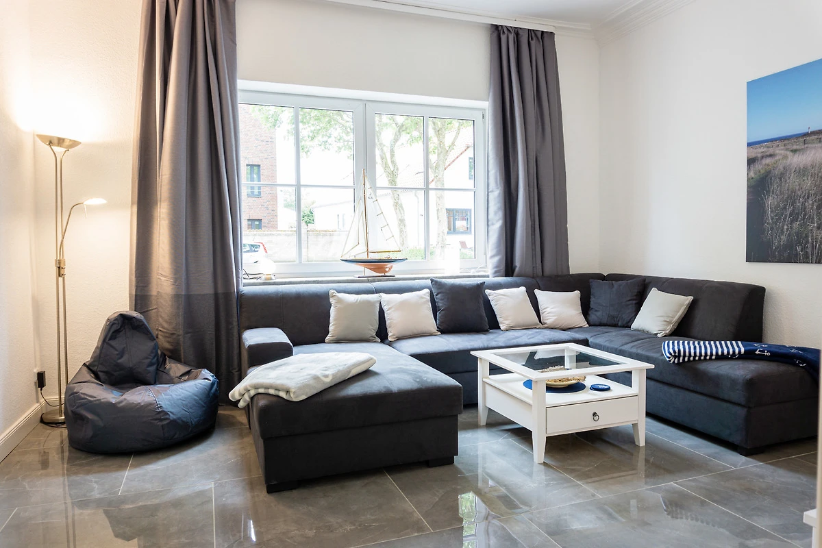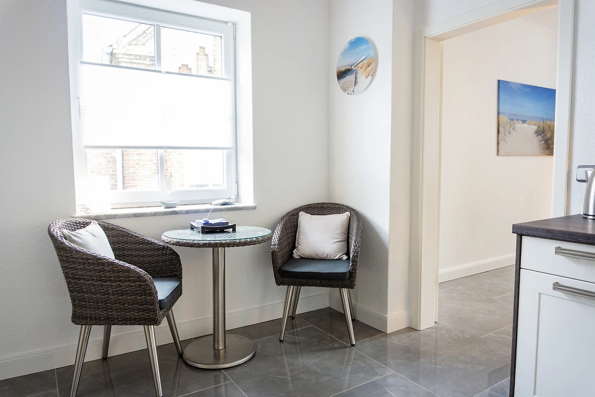 Ihre Ferienwohnung "Mien Tied MITTENMANG" ist eine ca. 100 m² grosse Ferienwohnung im Erdgeschoss des Haupthauses. Hier können Sie Ihr Auto stehen lassen. Zu der Ferienwohnung gehört auch ein PKW - Stellplatz. Den braucht man in der Innenstadt! Denn die Lage im Thulboden sorgt für kurze Wege. Nur 150 Schritte und Sie können im Kommunalhafen ein zünftiges Essen in der Fischhalle geniessen. Machen Sie sich bei uns gemütlich. In 1.2 km Entfernung befindet sich der nächste Strand. Das besondere an dem Appartement ist, dass jedes Schlafzimmer über ein eigenes Bad verfügt.