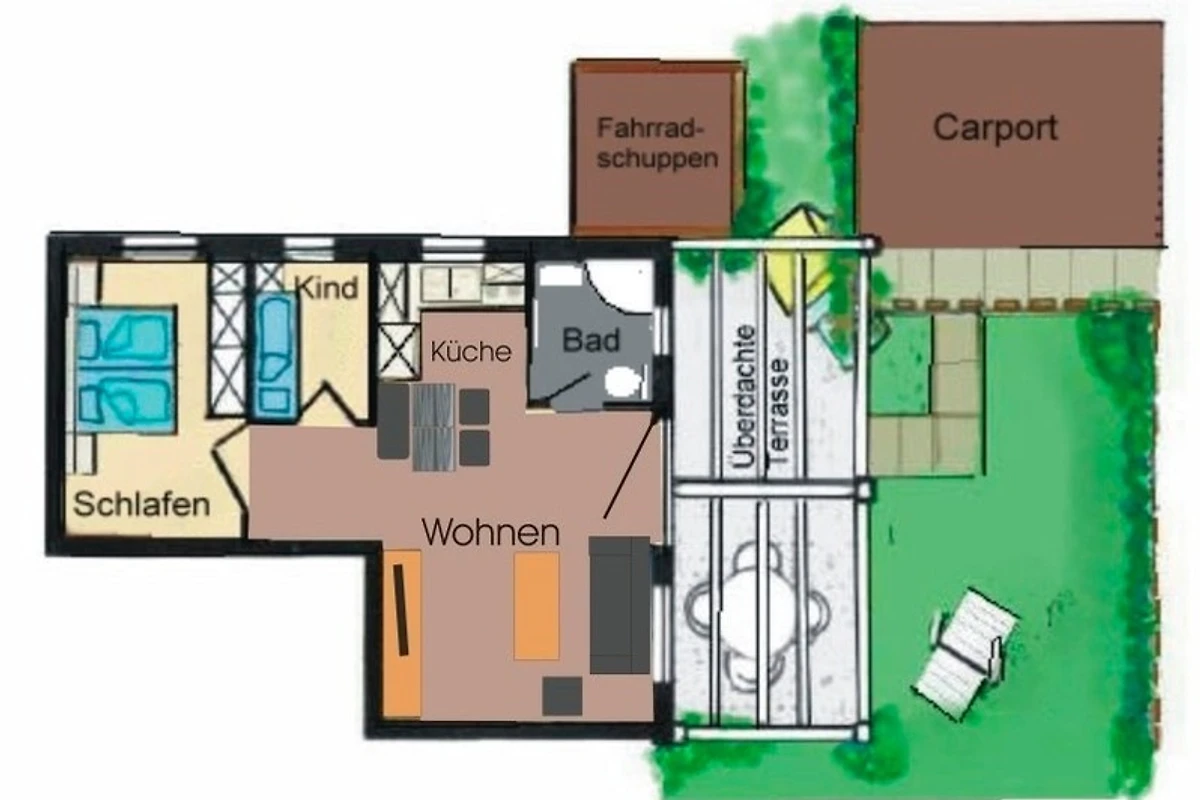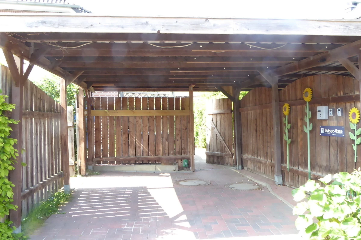In dem Fahrradschuppen können selbst mitgebrachte Fahrräder sicher verschlossen werden. Für die Anreise mit dem Auto kann das eigene Carport direkt vor der Tür genutzt werden. Im Sinne der Nachhaltigkeit gibt es hier auch eine E-Auto-Ladesteckdose.