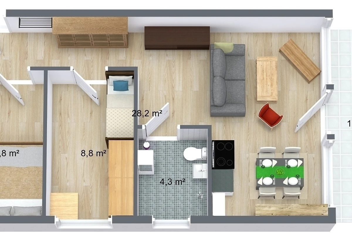 Zum Apartment: Der Eingang befindet sich ebenerdig im Haus 5a. Ihr Fahrzeug parken Sie bitte auf dem Stellplatz 29. Das Apartment selbst befindet sich im 2. Stockwerk, Richtung Seeseite. Es verfügt über 52 qm, aufgeteilt auf ein Eltern Schlafzimmer (8 qm) mit Doppelbett (1,40 x 2,00), ein (Kinder-) Zimmer (9 qm) mit Stockbett (je 0,90 x 2,00) sowie ein grosszügiges Wohnzimmer mit Schlafcouch (ebenfalls 1,40 x 2,00 Liegefläche). Alle Zimmer haben – z.T. seitlichen – Meerblick, das Wohnzimmer verfügt über einen nicht einsehbaren Balkon, ebenfalls mit seitlichem Blick zur Ostsee, die gerade mal 200m entfernt ist. Auf dem Balkon in Südwestlage können Sie die Nachmittags- und Abendsonne geniessen. Im Wohnzimmer gibt es eine Essecke mit Durchreiche zur voll ausgestatteten Küchenzeile mit Geschirrspüler, Senseo Kaffeeautomat, Kaffeemaschine, Toaster etc. Backofen mit Grill und Mikrowelle ist vorhanden.
