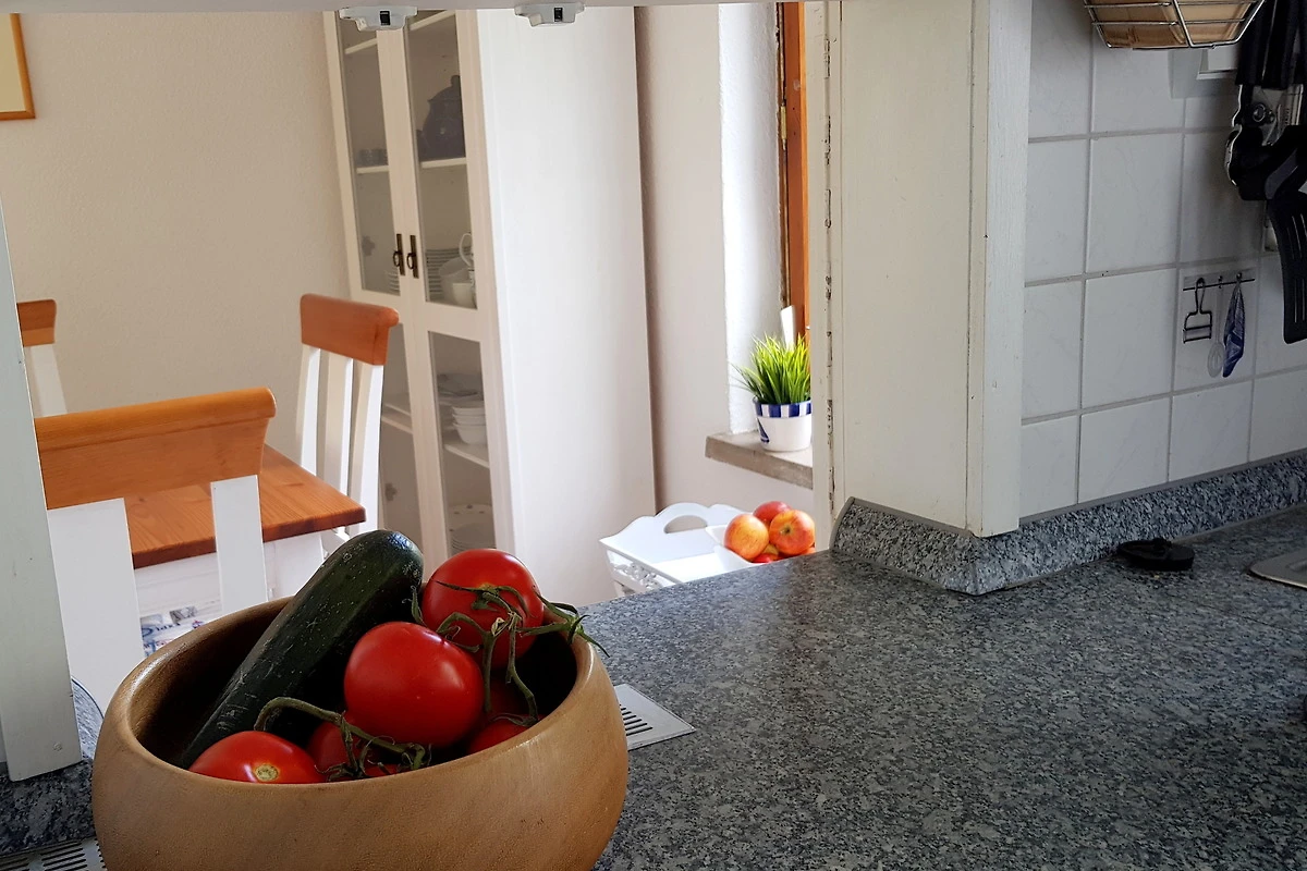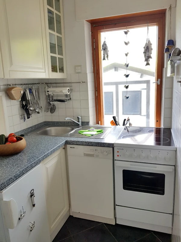 Im Erdgeschoss befindet sich eine kleine Küche, ausgestattet mit Kühlschrank , Geschirrspüler, und div. Elektrogeräten (Kaffeemaschine, Wasserkocher, Toaster) und allem anderen was man so zum Kochen benötigt. Angrenzend befindet sich die Essecke für 4-6 Personen. Zwischen Küche und Essbereich gibt es eine Durchreiche.