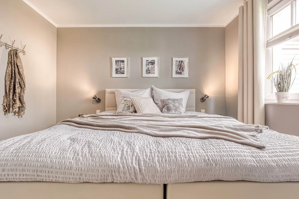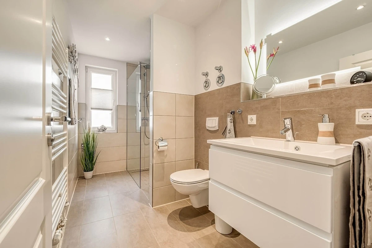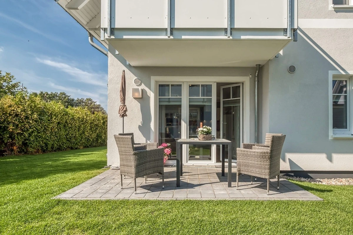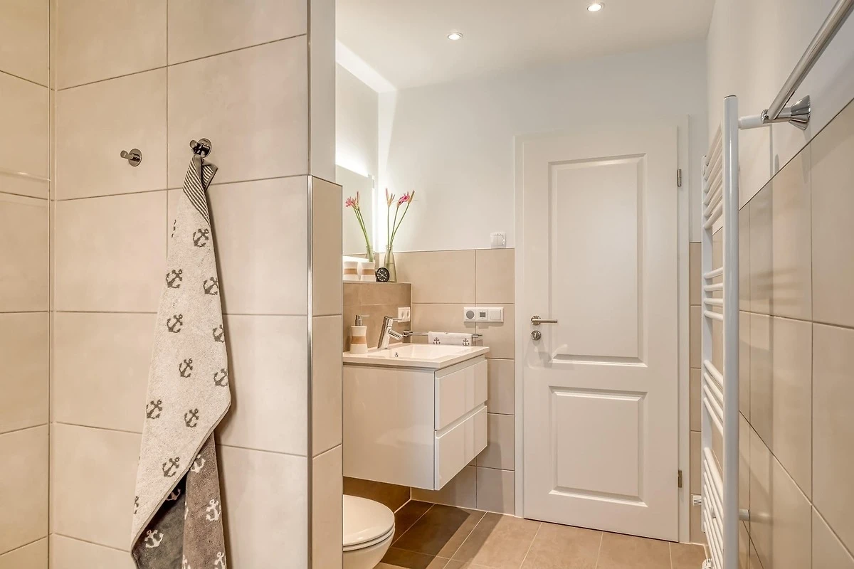 Die exklusiv eingerichtete Wohnung verfügt über einen Wohnraum mit angrenzendem Ess- und Küchenbereich, einem Bad, einem Schlafzimmer, einer Diele und einer Terrasse mit Sitzgruppe und Sonnenschirm. Die voll ausgestattete Küche mit Induktionsherd, eingebautem Hochbackofen, eingebauter Mikrowelle, Spülmaschine, Kühlschrank mit Gefrierfach, sowie Kaffee- und Senseomaschine bildet mit der Essecke und dem Wohnbereich eine gemütliche Einheit. Das moderne Bad besticht durch den ebenerdigen Duschbereich mit Kopfbrause, einem Handtuchheizkörper und einem eingebauten Radio. Das Schlafzimmer ist mit einem Boxspringbett und einem LED Fernseher ausgestattet.