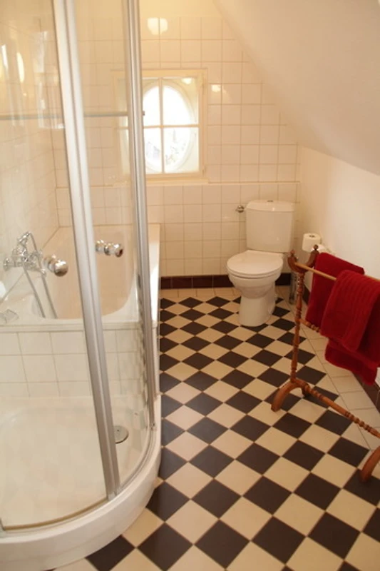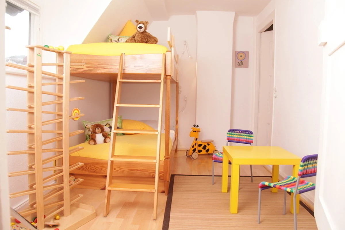 2nd floor (pitched roof, partly limited standing height): bedroom with double bed (2,00m), suite, satellite TV and washbasin. Bedroom with french bed. Bed (1.60m ), bedroom with bunk bed, shower/WC.