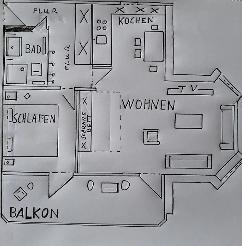 Im Wohn-/Schlafzimmer befindet sich ausserdem ein Schrankbett in einer Grösse von 2 x 80 = 1,60 m x 2,00 m. Der Balkon ist ebenfalls von dort aus zu betreten.