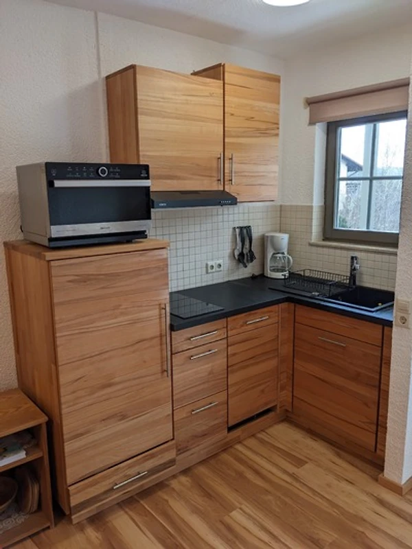 Die komplett ausgestattete Küche verfügt über ein Kochfeld.