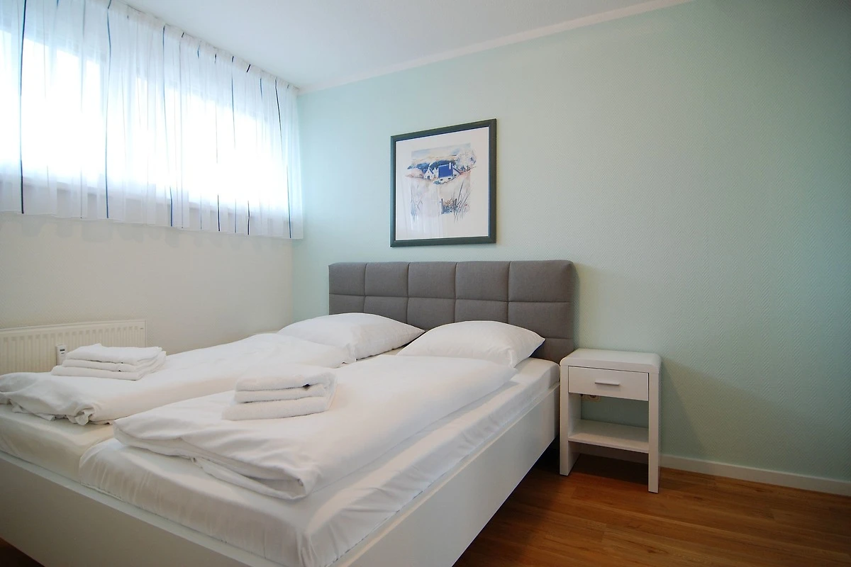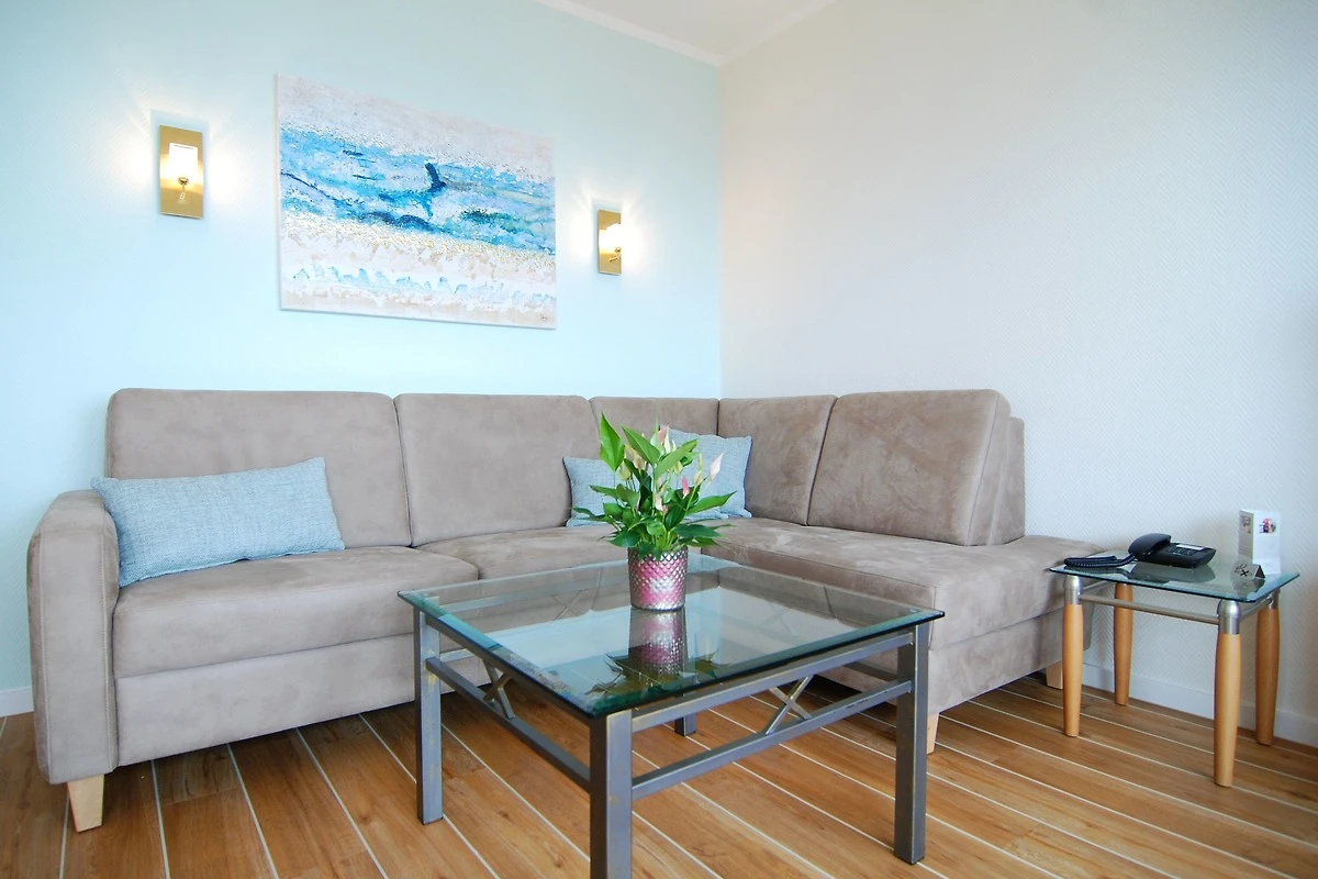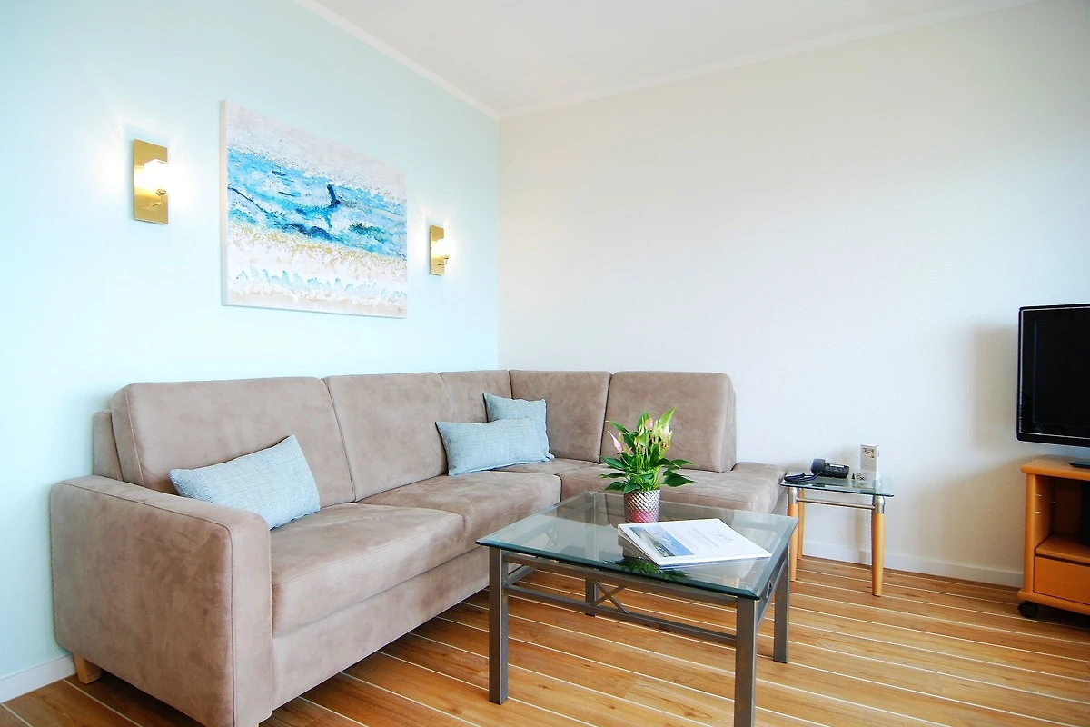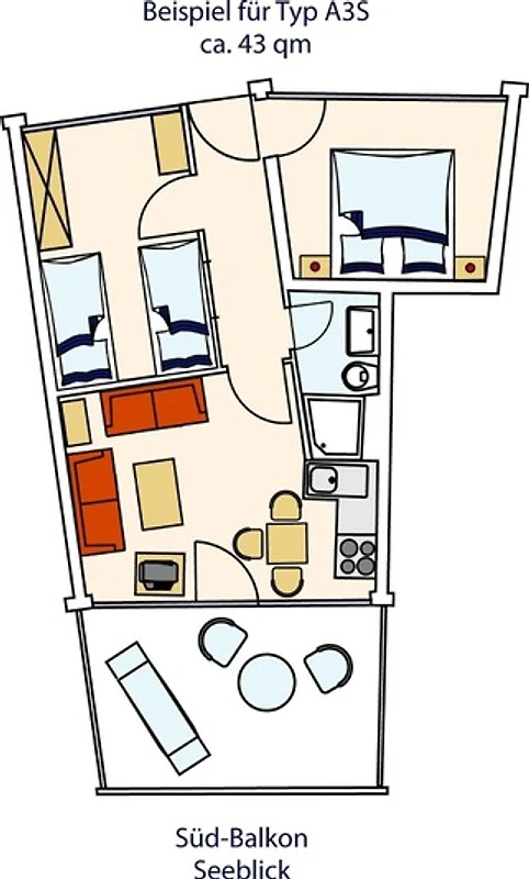 Die Apartments vom Typ A3S haben zwei Schlafzimmer, einen Wohnraum, Kochnische, Dusche, WC, Südbalkon und Seeblick. Mit einer Wohnfläche von 43 qm sind sie für bis zu 4 Personen geeignet.