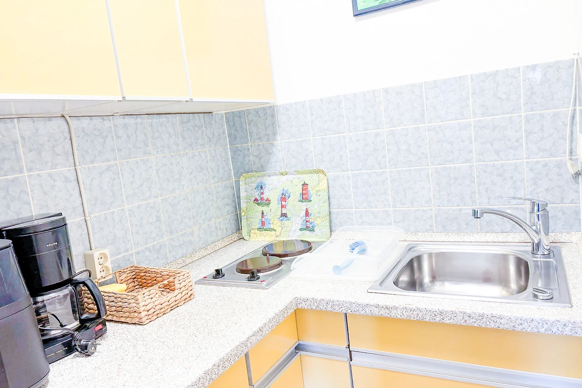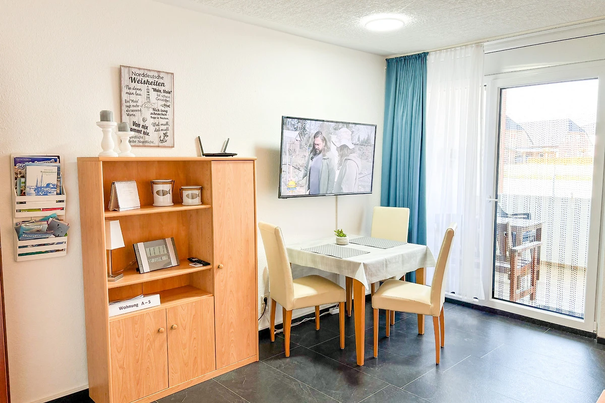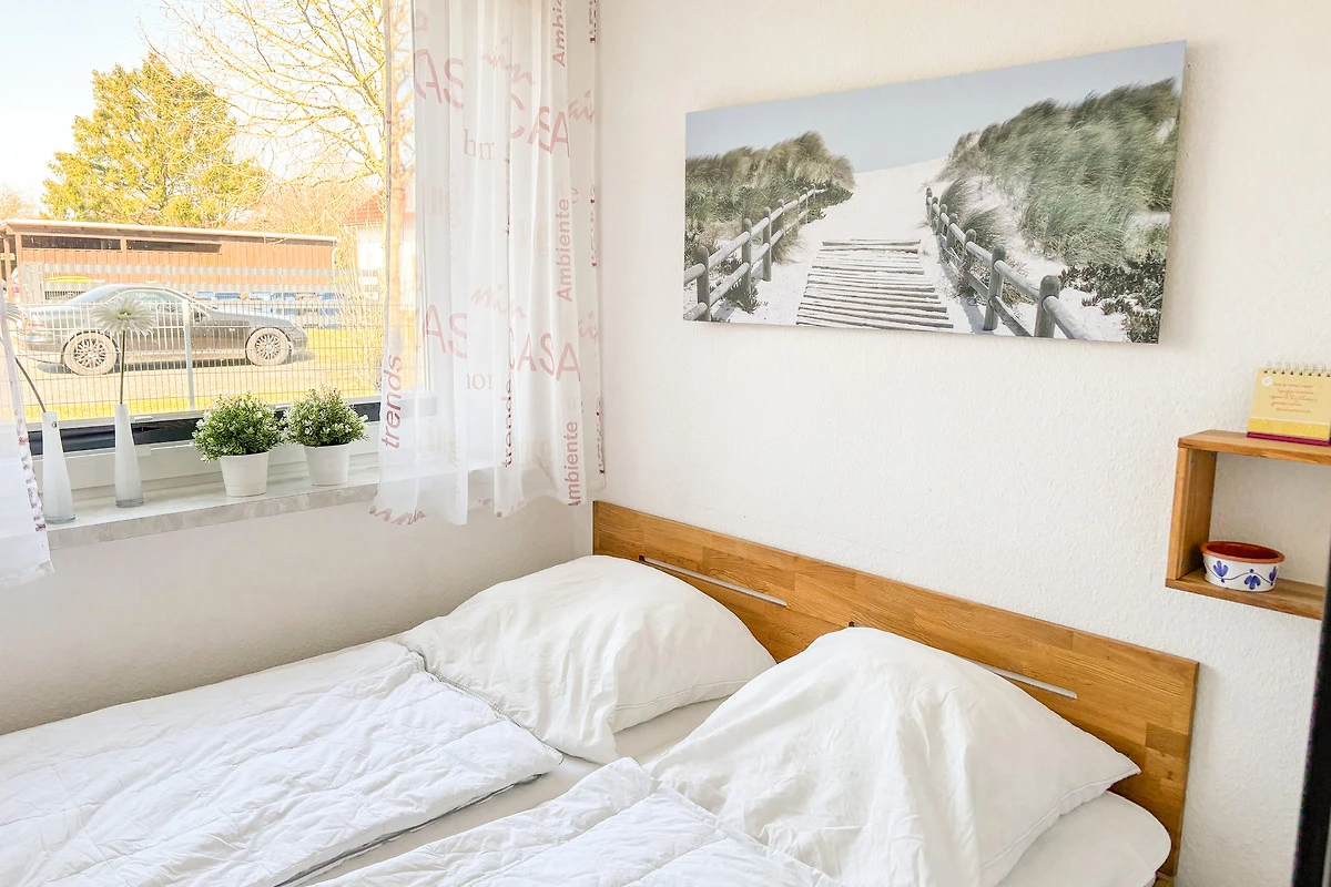 Die Ferienwohnung liegt im Erdgeschoss der Appartementanlage und verfügt über ein Wohnzimmer mit Schlafcouch für 1 Person, Kabel-TV, Radio, Essecke u. Kochnische (2-Plattenherd, Wasserkocher, Kaffeemaschine, Toaster), ein Schlafzimmer mit zwei Einzelbetten, ein Badezimmer mit Dusche/ WC sowie einen Balkon mit Gartenmöbeln. Haustiere werden sind nicht gestattet.