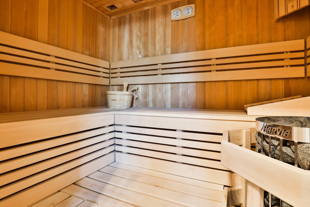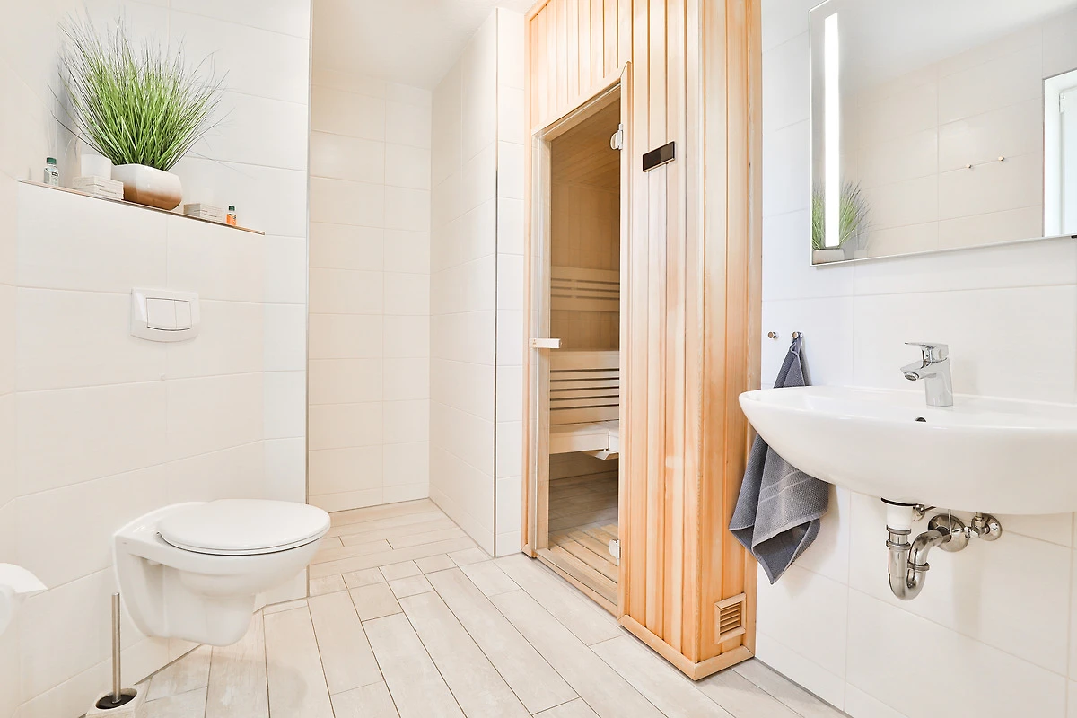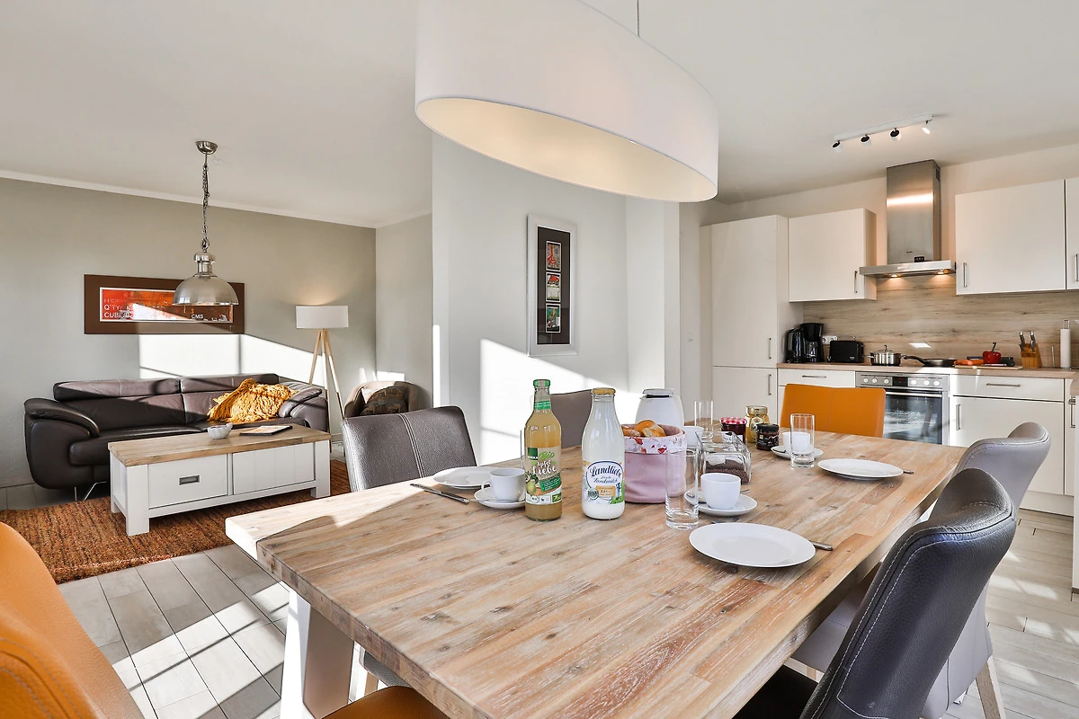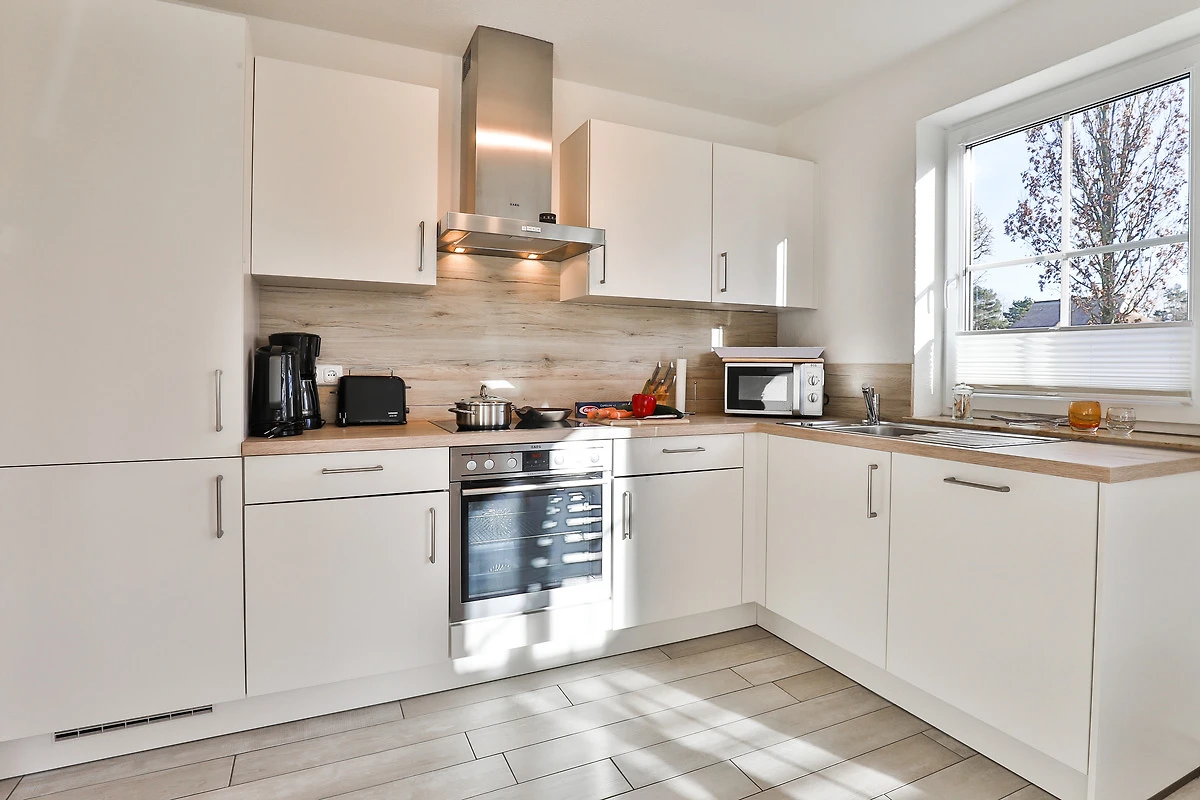 ... und ist ausgestattet mit drei Schlafräumen (1x1 Doppelbett, 1x1 Doppelbett , 1x2 Einzelbetten) jeweils mit zusätzlichen Verdunklungsmöglichkeiten, einem Wohnbereich mit Kamin und einer Küchenzeile (Mikrowelle, Cerankochfeld, Backofen, Kühlschrank mit Gefrierfach, Spülmaschine, Kaffeemaschine), zwei Bädern (1 x bodengleiche Dusche / WC und Sauna,