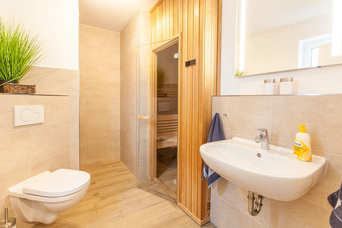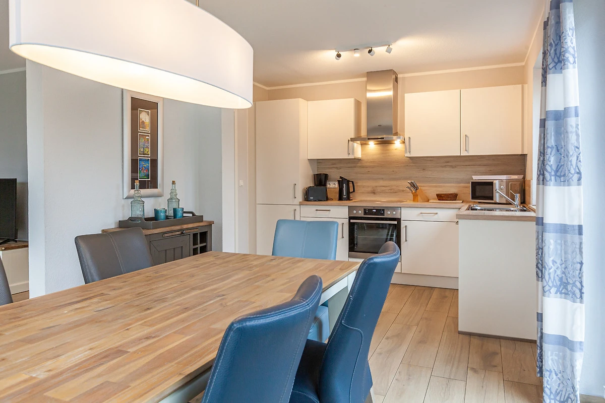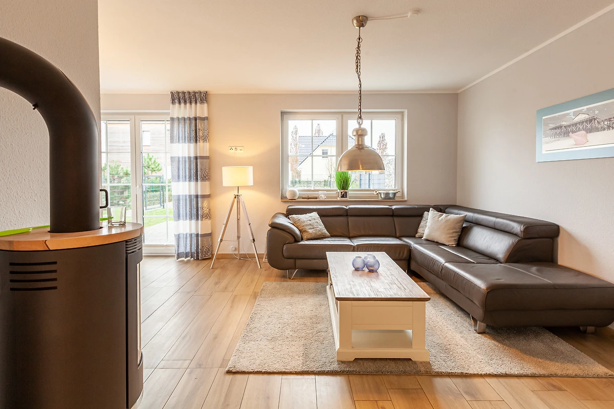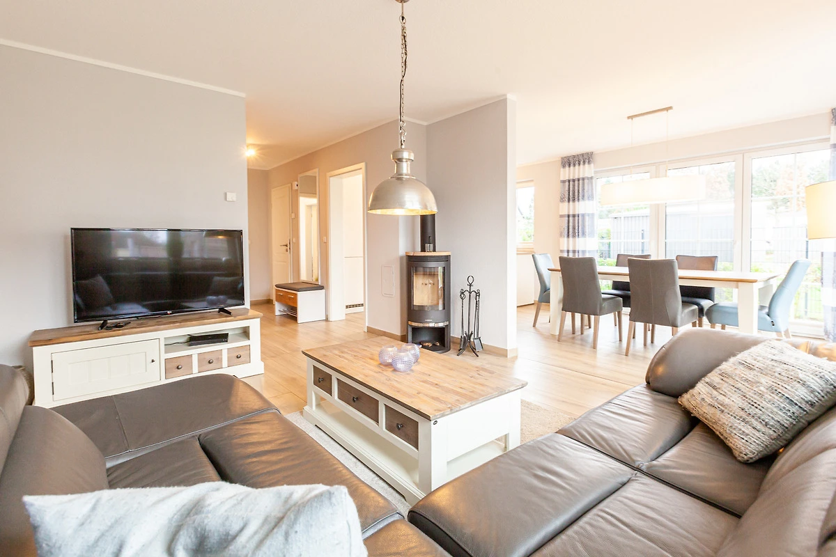 ... und ist ausgestattet mit drei Schlafräumen (1x1 Doppelbett, 1x1 Doppelbett, 1x2 Einzelbetten) jeweils mit zusätzlichen Verdunklungsmöglichkeiten, einem Wohnbereich mit Kamin und einer Küchenzeile (Mikrowelle, Cerankochfeld, Backofen, Kühlschrank mit Gefrierfach, Spülmaschine, Kaffeemaschine), zwei Bädern (1 x bodengleiche Dusche / WC und Sauna,