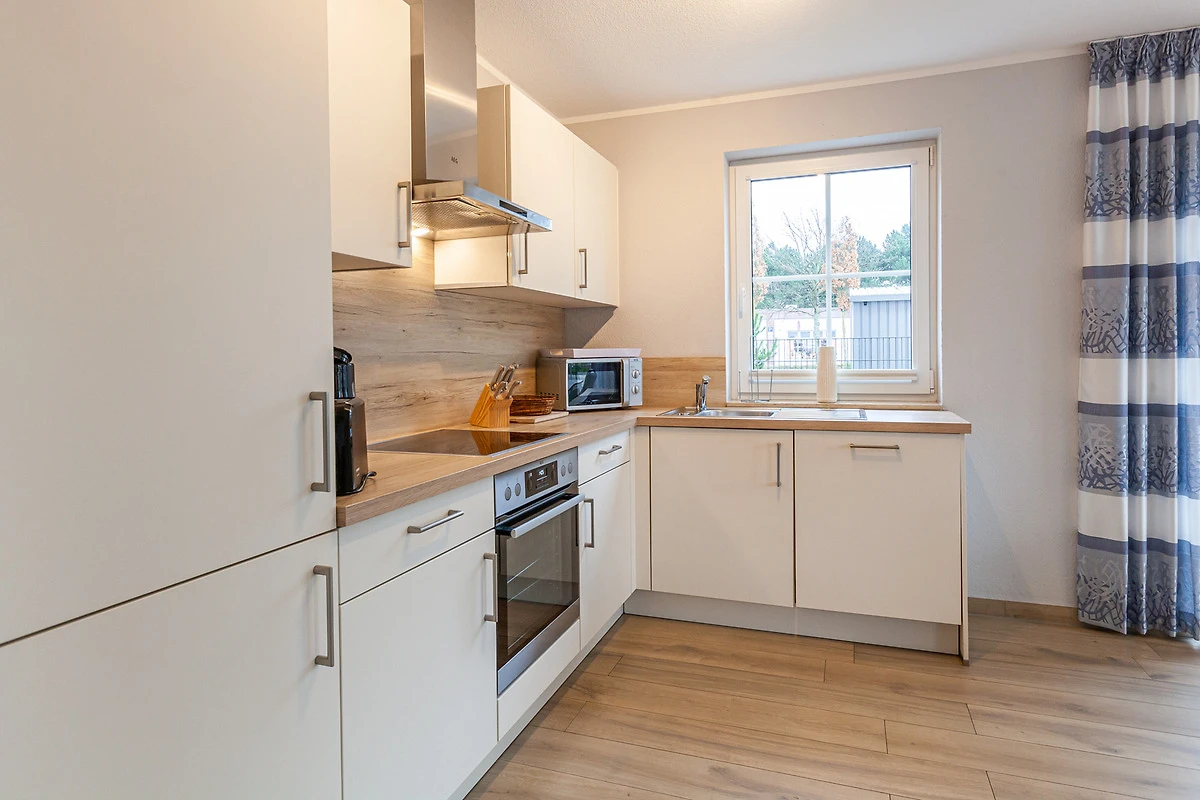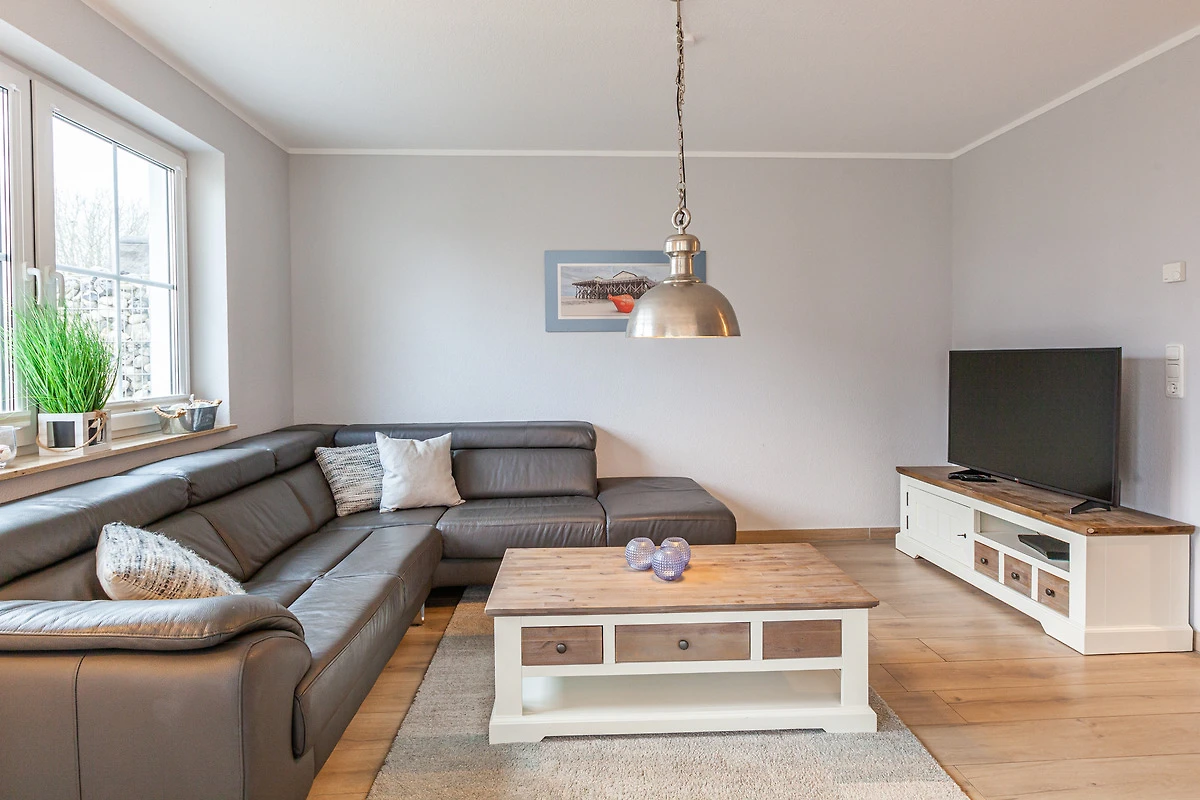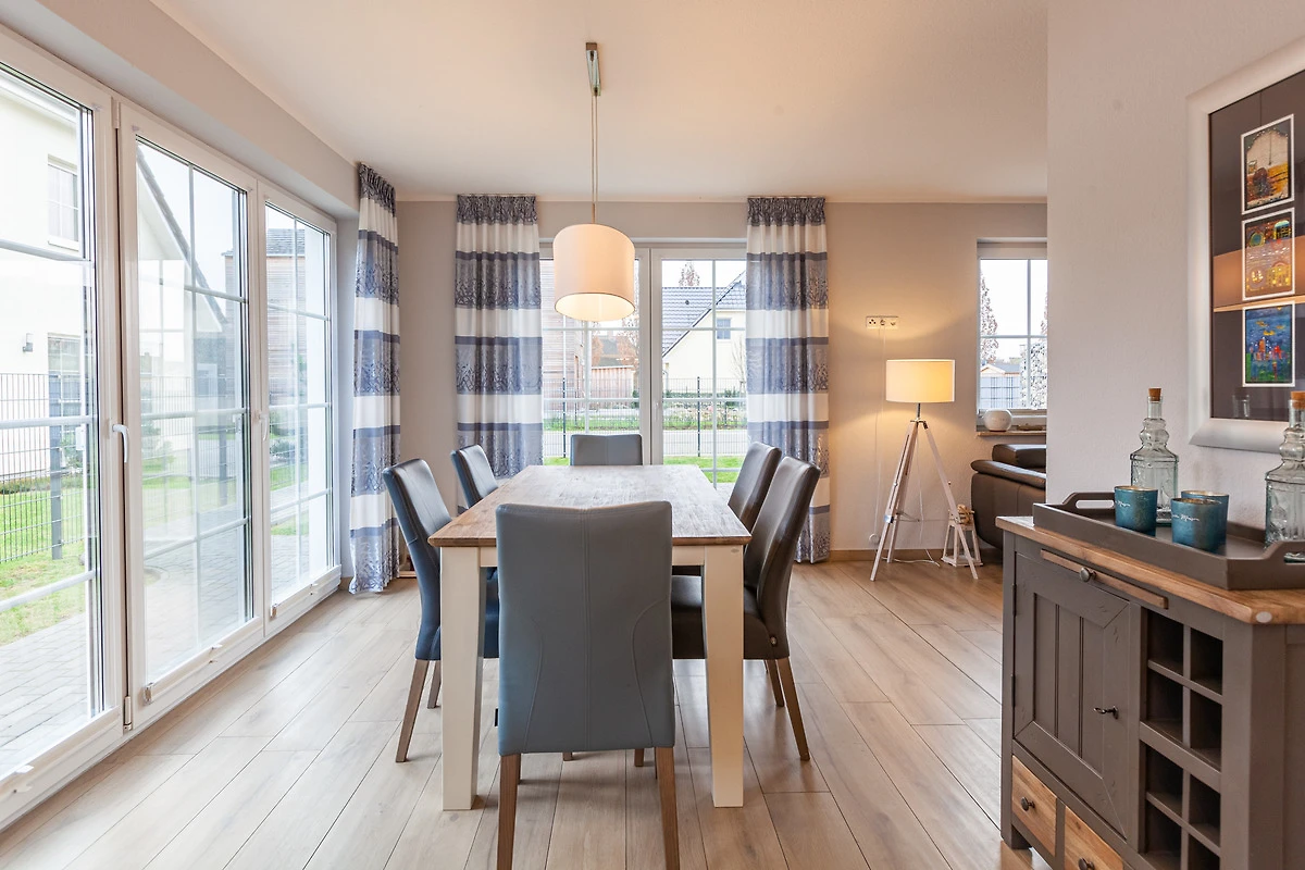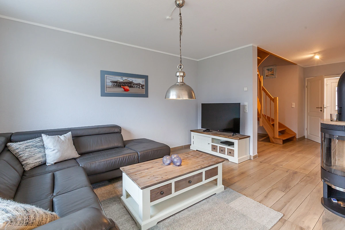 ... und ist ausgestattet mit drei Schlafräumen (1x1 Doppelbett, 1x1 Doppelbett, 1x2 Einzelbetten) jeweils mit zusätzlichen Verdunklungsmöglichkeiten, einem Wohnbereich mit Kamin und einer Küchenzeile (Mikrowelle, Cerankochfeld, Backofen, Kühlschrank mit Gefrierfach, Spülmaschine, Kaffeemaschine), zwei Bädern (1 x bodengleiche Dusche / WC und Sauna,