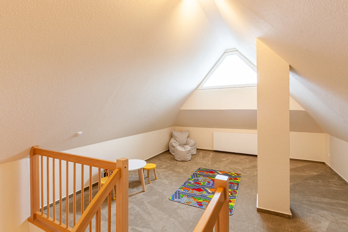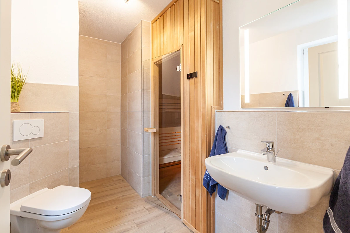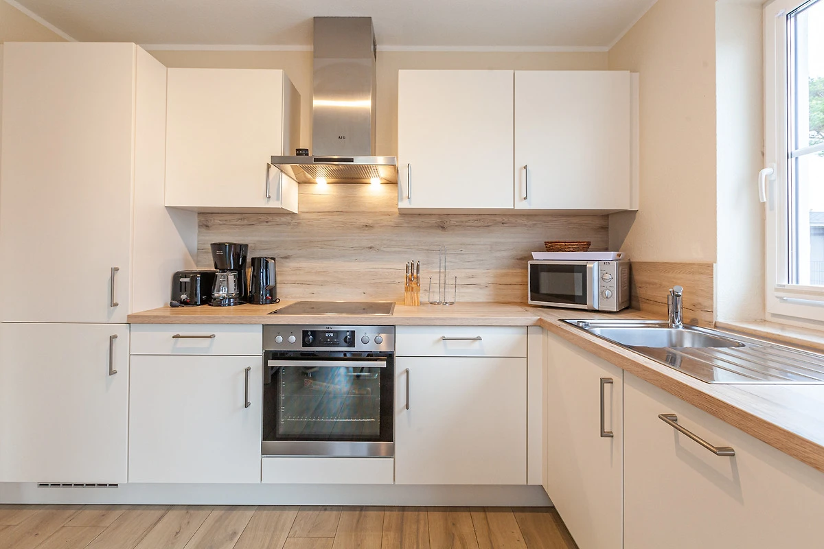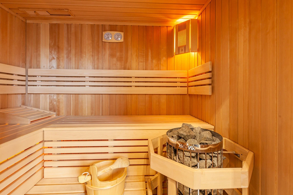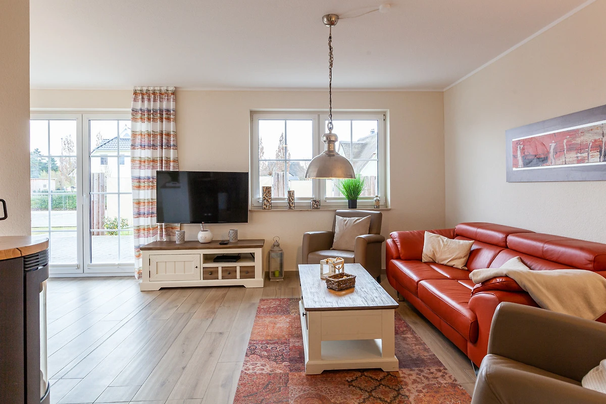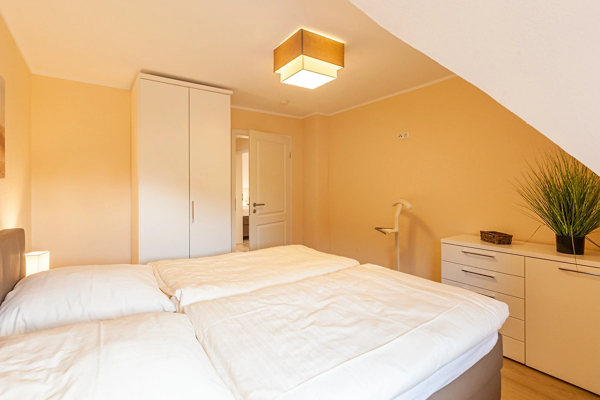 ... und ist ausgestattet mit drei Schlafräumen (1x1 Doppelbett, 1x1 Doppelbett, 1x2 Einzelbetten) jeweils mit zusätzlichen Verdunklungsmöglichkeiten, einem Wohnbereich mit Kamin und einer Küchenzeile (Mikrowelle, Cerankochfeld, Backofen, Kühlschrank mit Gefrierfach, Spülmaschine, Kaffeemaschine), zwei Bädern (1 x bodengleiche Dusche / WC und Sauna,