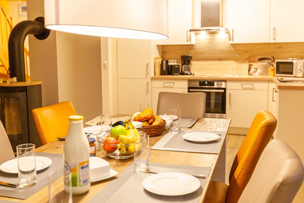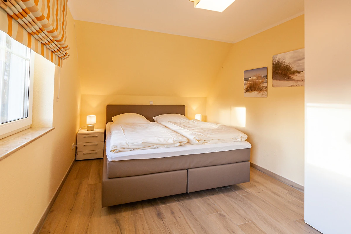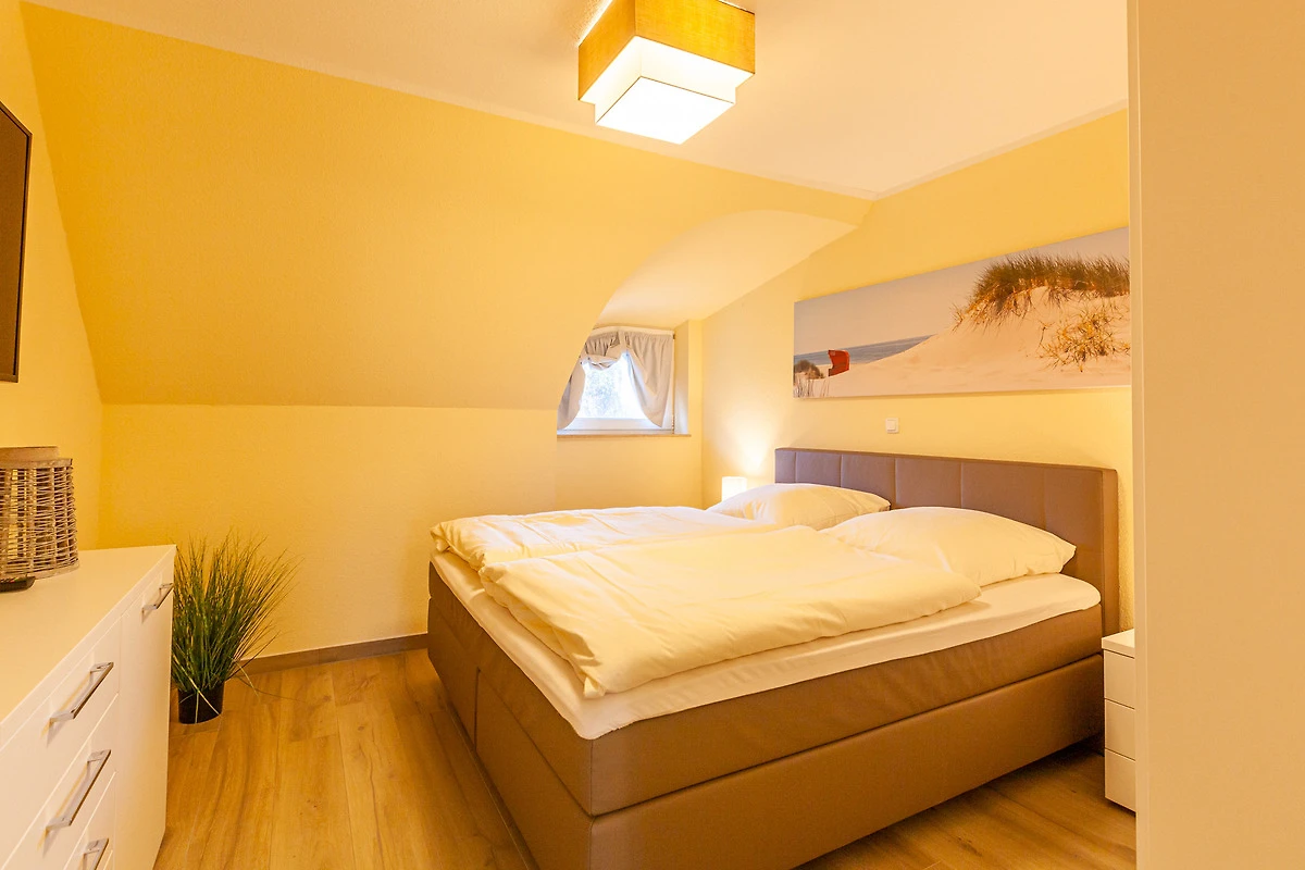 ... und ist ausgestattet mit drei Schlafräumen (1x1 Doppelbett, 1x1 Doppelbett, 1x2 Einzelbetten) jeweils mit zusätzlichen Verdunklungsmöglichkeiten, einem Wohnbereich mit Kamin und einer Küchenzeile (Mikrowelle, Cerankochfeld, Backofen, Kühlschrank mit Gefrierfach, Spülmaschine, Kaffeemaschine), zwei Bädern (1 x bodengleiche Dusche / WC und Sauna,