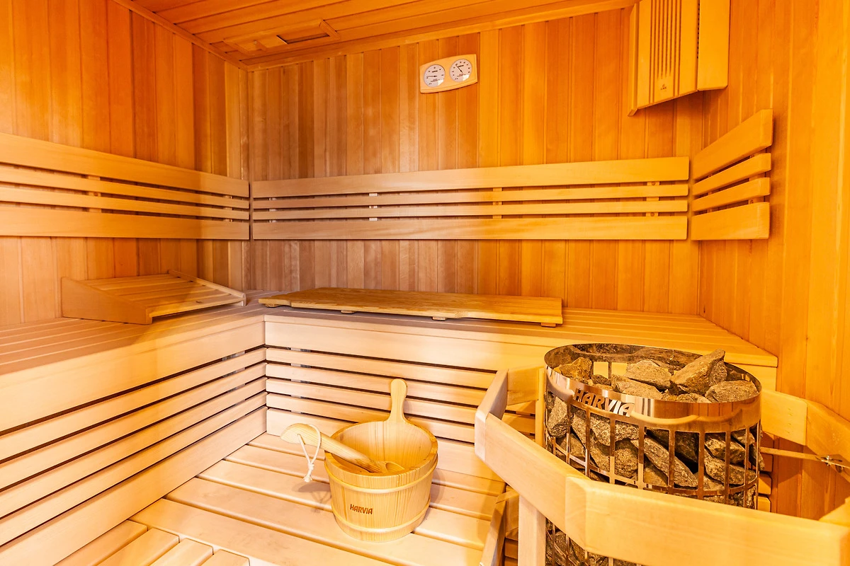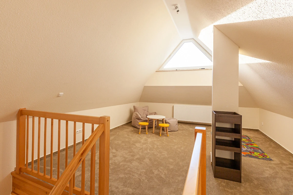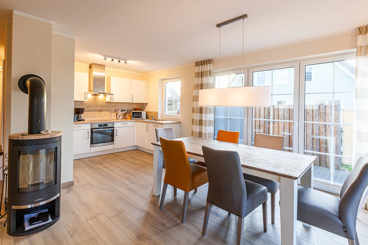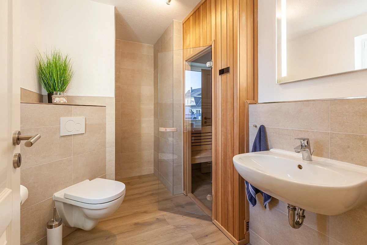 ... und ist ausgestattet mit drei Schlafräumen (1x1 Doppelbett, 1x1 Doppelbett, 1x2 Einzelbetten) jeweils mit zusätzlichen Verdunklungsmöglichkeiten, einem Wohnbereich mit Kamin und einer Küchenzeile (Mikrowelle, Cerankochfeld, Backofen, Kühlschrank mit Gefrierfach, Spülmaschine, Kaffeemaschine), zwei Bädern (1 x bodengleiche Dusche / WC und Sauna,