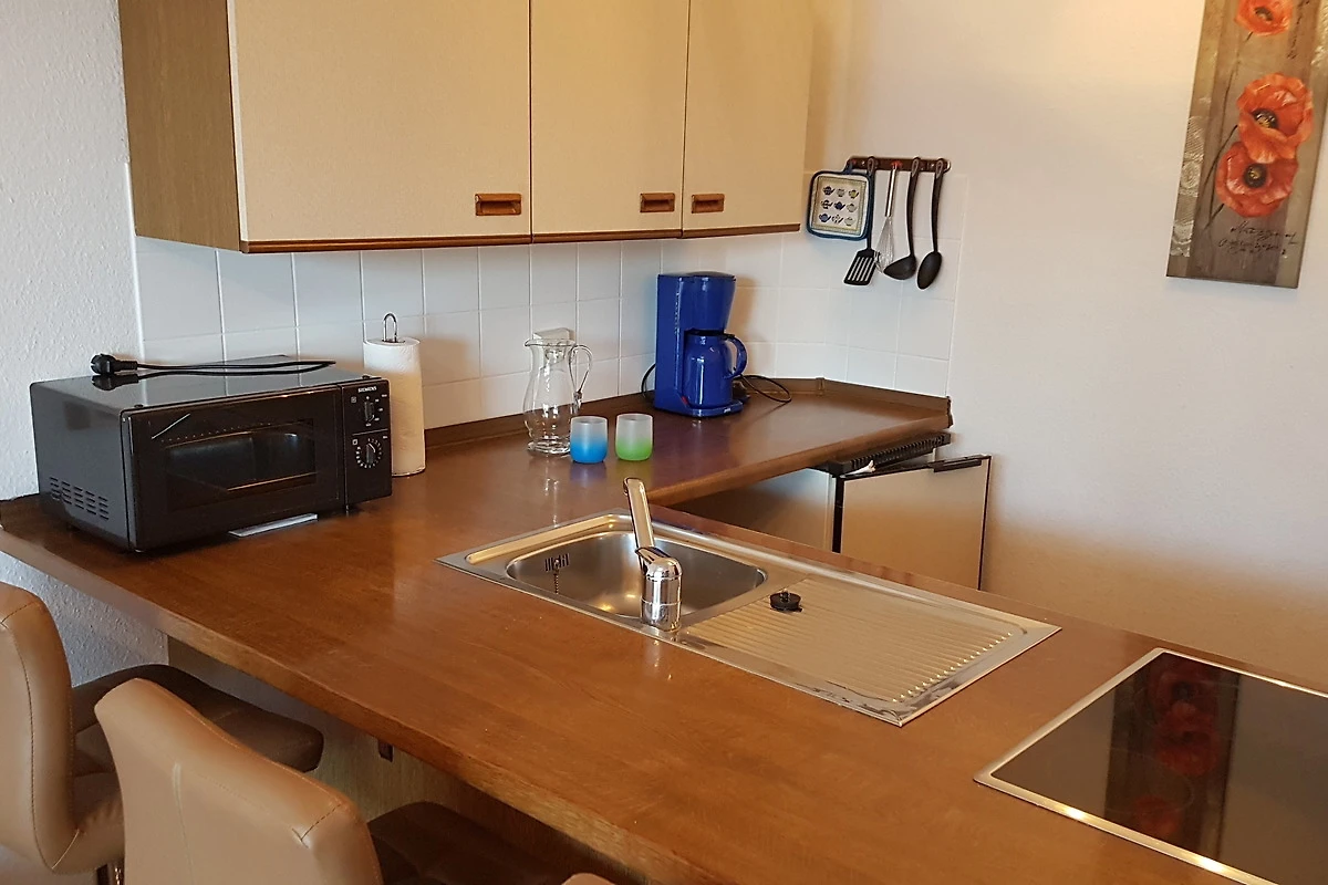 Die vollständig eingerichtete Küche verfügt über einen Esstresen mit 3 Sitzgelegenheiten. Im Schlafzimmer befindet sich ein grosser Kleiderschrank sowie ein Doppelbett mit jeweils zwei Einzelmatratzen. Im hellen Wohnzimmer erwartet Sie ein Flachbild-TV und die bequeme Schlafcouch. Das funktionelle Bad ist ausgestattet mit Dusche, WC und Haartrockner.
