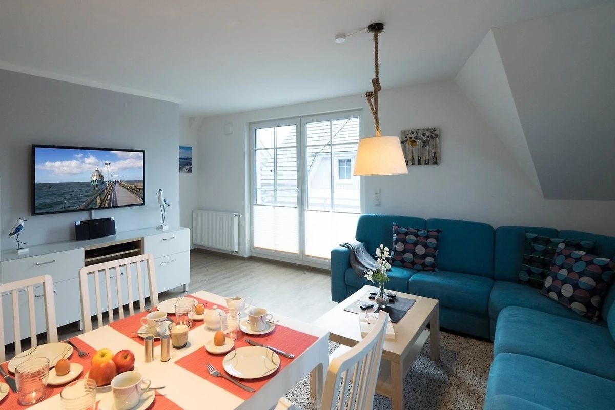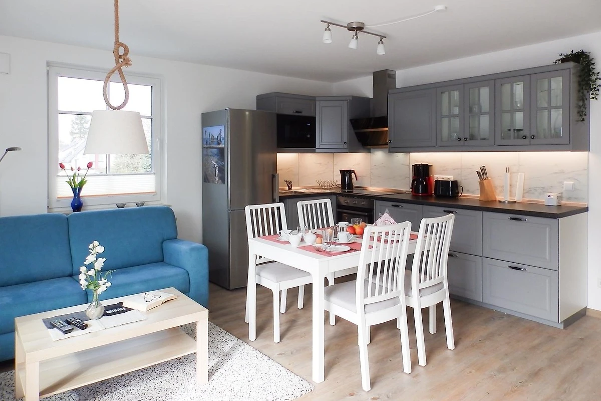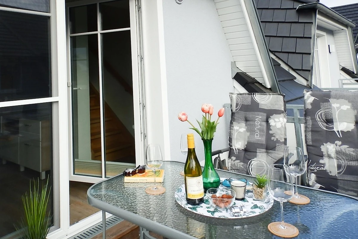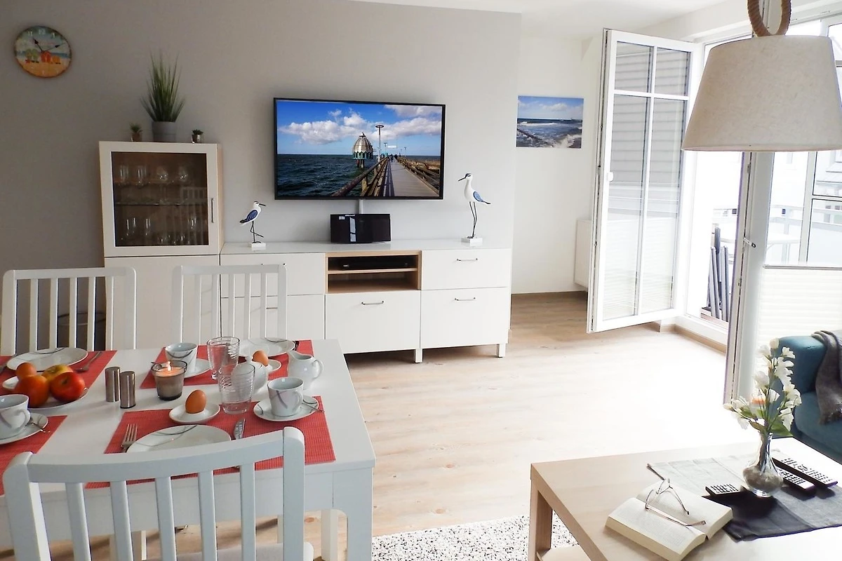 Im kombinierten Wohn- und Küchenbereich befindet sich ein bequemes, grosses Ecksofa. Der grosse Flachbildfernseher mit SAT-TV, ein Blu-ray-Player und ein Radio laden zum abendlichen Unterhaltungsprogramm ein. WLAN steht in der gesamten Wohnung kostenlos zur Verfügung. Der Küchenbereich hat einen elektrischen Backofen, ein 4-Zonen Induktionskochfeld, eine Geschirrspülmaschine und ein Kühl/Gefrierschrank. Toaster, Wasserkocher, Kaffeemaschine und Mikrowelle gehören ebenfalls zur Ausstattung. Unser modern eingerichtetes Badezimmer verfügt über eine grosse, bodengleiche Dusche für das pure Duschvergnügen. Weiterhin verfügt unsere Wohnung über ein separaten Abstellraum mit einigen Reinigungsutensilien. Das Rauchen ist in unserer Ferienwohnung nicht gestattet. Gegen eine Zigarette auf dem Balkon ist aber sicher nichts einzuwenden. Auf dem (Süd-) Balkon stehen gemütliche Gartenmöbel bereit. Geniessen Sie hier nach einem sonnenreichen Tag am Strand einen wunderschönen Abend. Für die mitgebrachten Fahrräder steht ein eigener Fahrradschuppen mit einer 220 V Steckdose zur Verfügung. Für Ihren PKW gibt es einen eigenen Stellplatz (Nr. 3) auf dem Gelände der Wohnanlage.