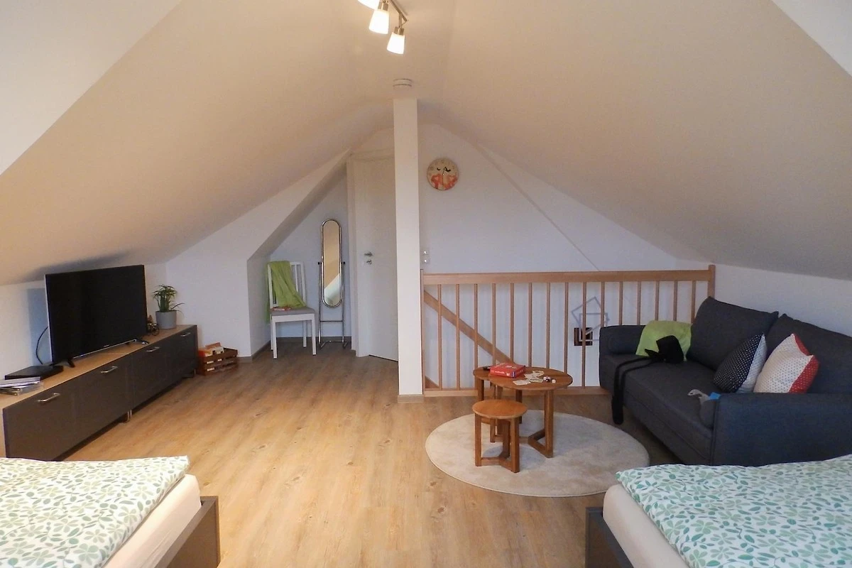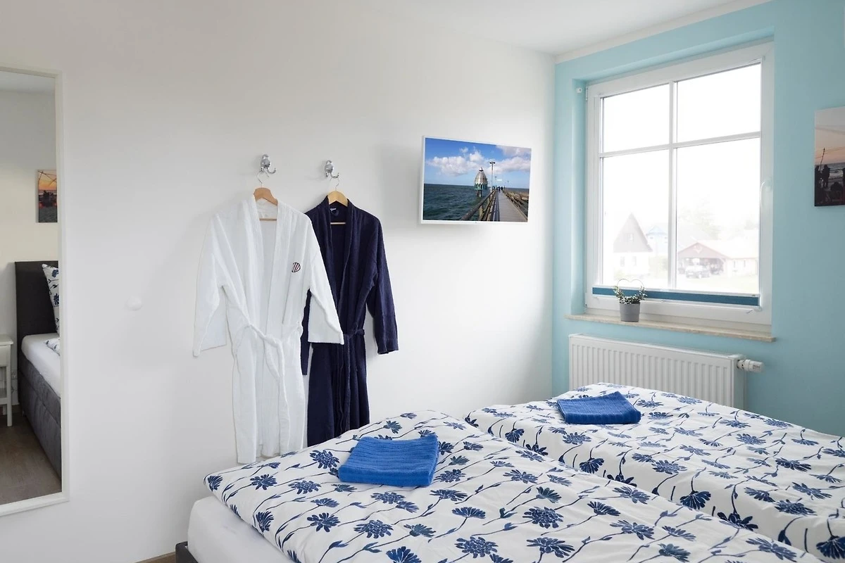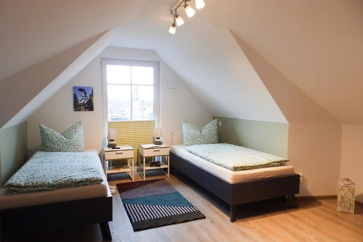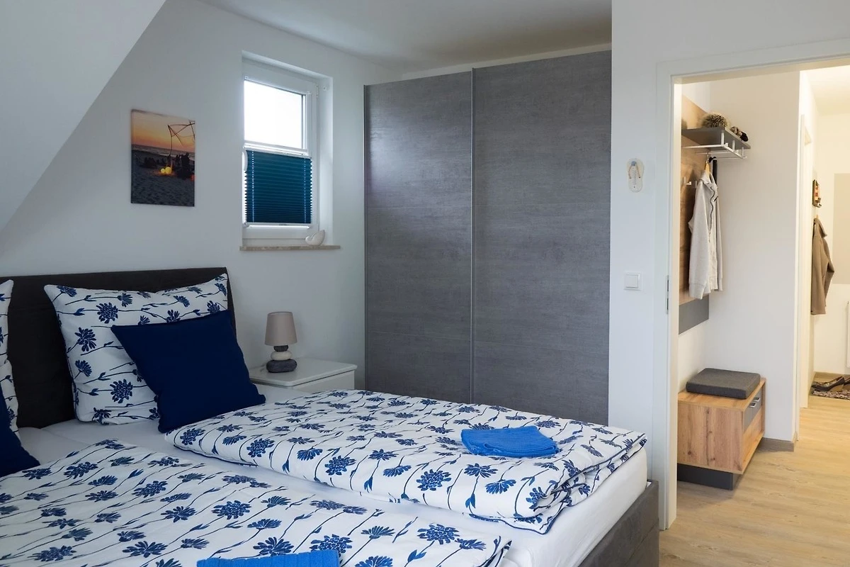 Im separaten Schlafzimmer ist ein grosses Doppelbett (1,80 x 2,00 m)und ein grosser Kleiderschrank vorhanden. Das Schlafzimmer verfügt über einen Flachbildfernseher. Im ausgebauten Dachgeschoss befinden sich zwei Einzelbetten (0,90 x 2,00 m), ein gemütliches Sofa und ein Flachbildfernseher mit Blu-Ray-Player. In einem kleinen, separaten Raum ist ausreichend Platz für Ihre persönlichen Sachen.