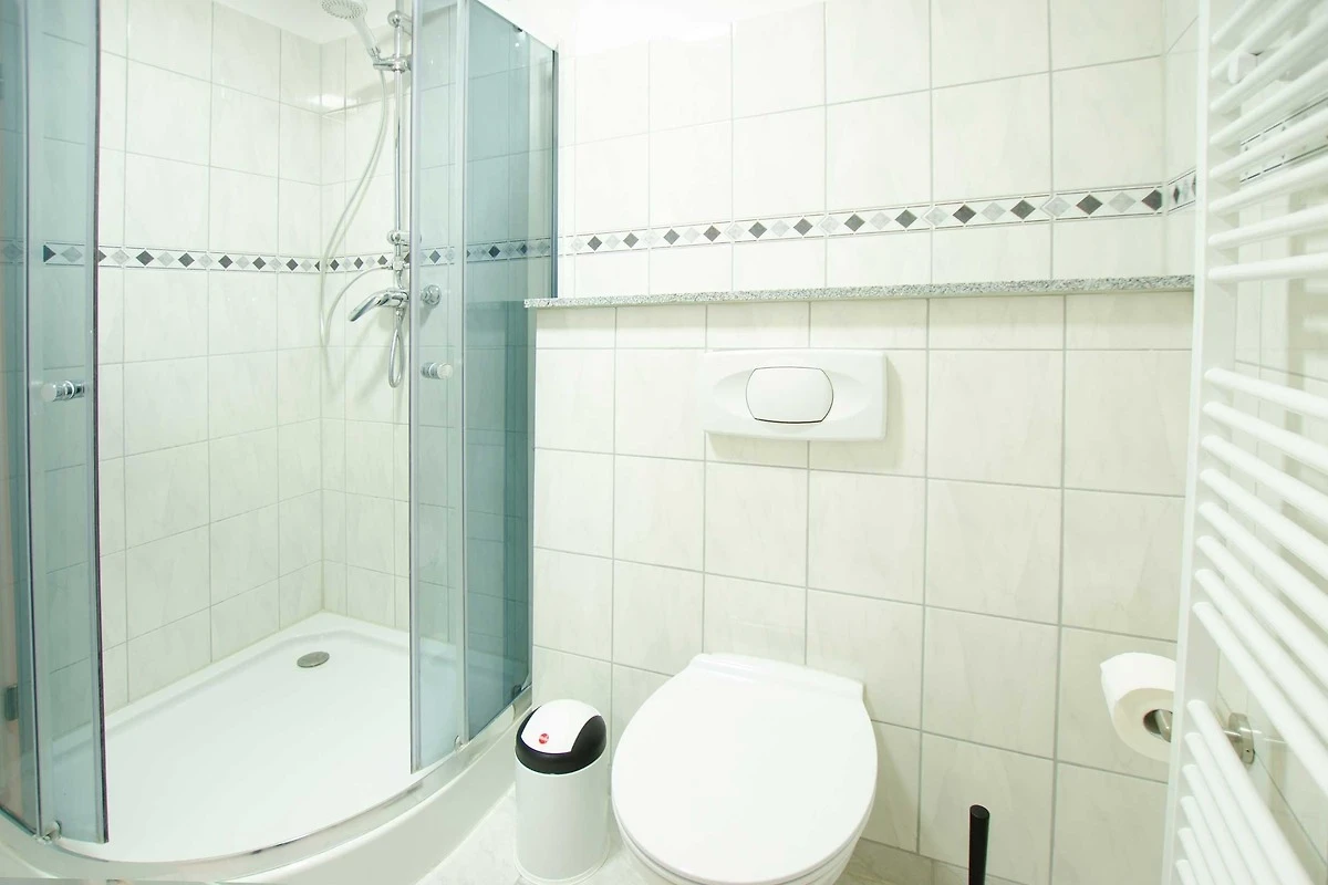 Das Badezimmer verfügt über eine Duschkabine und Handtuchwärmer.