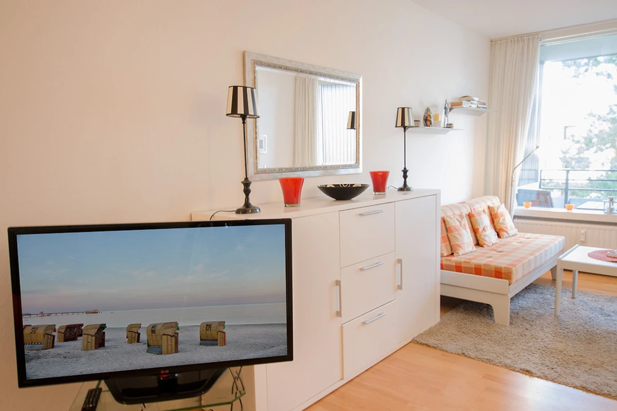 Das Wohnzimmer ist mit einer Schlafcouch und einer Essecke ausgestattet und hat direkten Zugang zum möblierten Balkon.