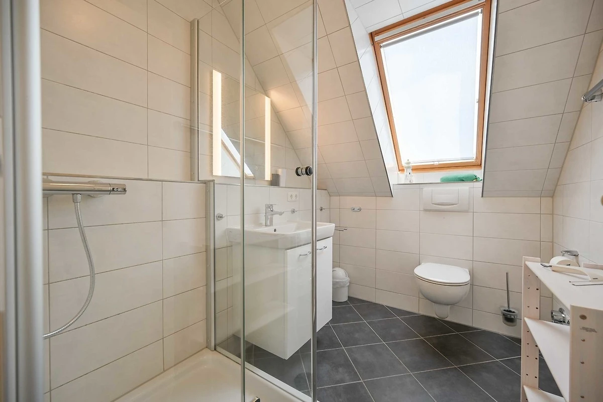 Ausserdem verfügt die Ferienwohnung über ein zweites Schlafzimmer im 2. Obergeschoss mit zwei Einzelbetten (je 0,90 m x 2,00 m) und einem zweiten Flachbild-TV. Aus dem oberen Schlafzimmer hat man je nach Jahreszeit Blick auf die Ostsee.