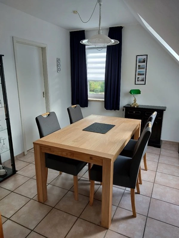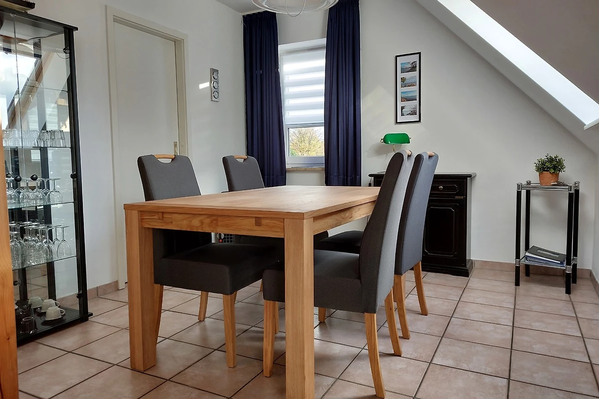 Gäste können es sich im Essbereich mit 4 Stühlen, grossem Esstisch, Vitrinenschrank und Kommode bequem machen.