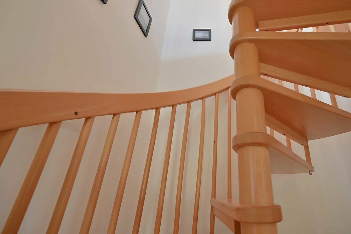 Die Ferienwohnung verfügt über ein Schlafzimmer mit Doppelbett (1,80 m x 2,00 m), Nachtschränken und grossem Kleiderschrank mit Spiegel, über ein Badezimmer mit Dusche und WC und einen geräumigen Flur mit Garderoben, Spiegel und Wendeltreppe ins zweite Obergeschoss. Durch eine grosse, doppelflügelige Glastür gelangt man durch den Flur ins Wohnzimmer.