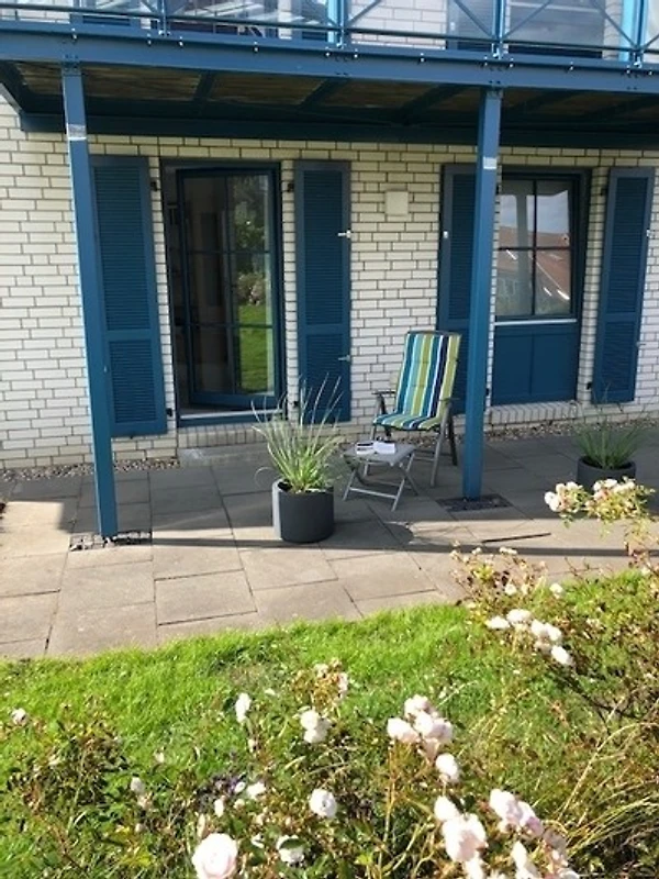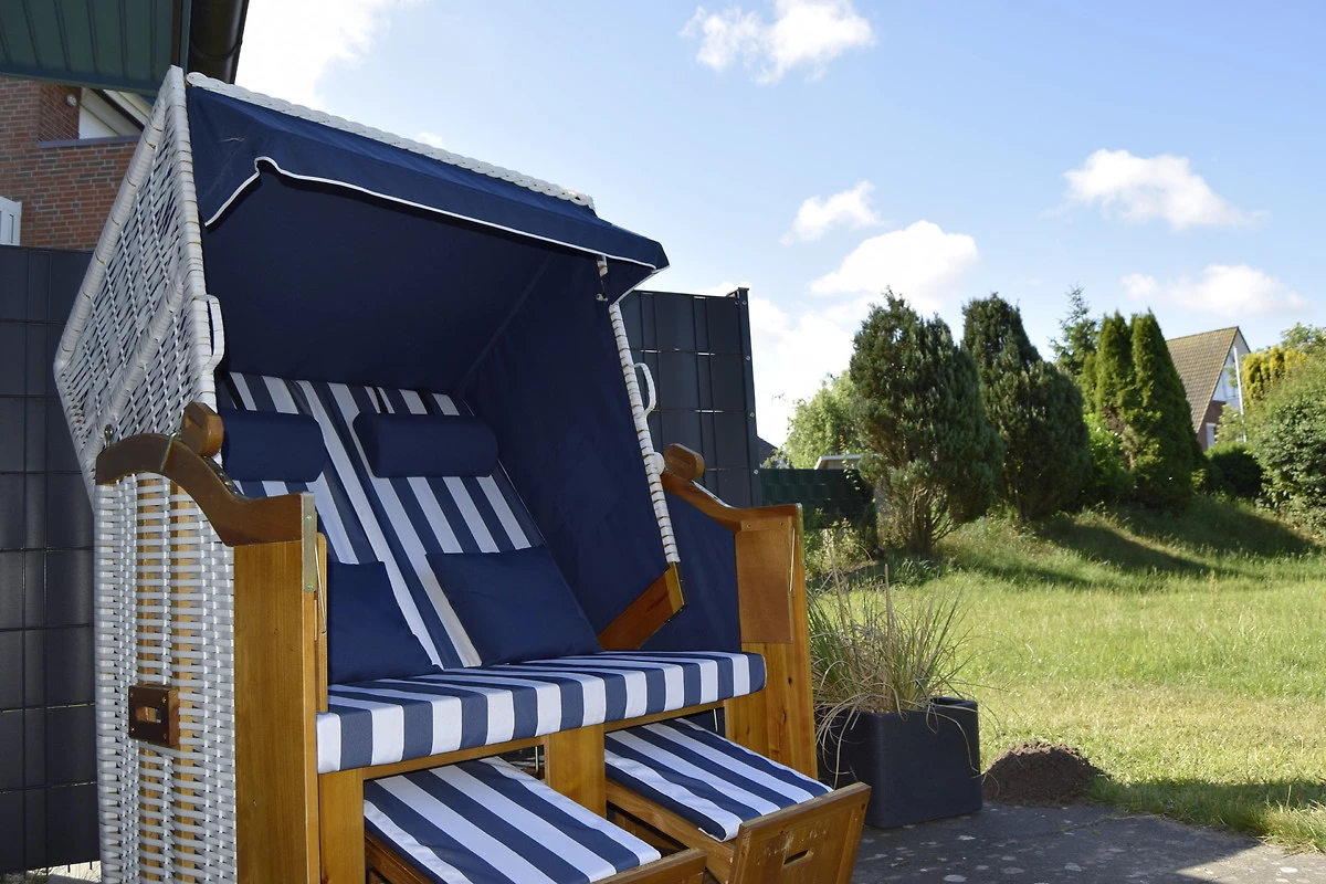Die grosszügige Ost- oder Süd-Terrasse ist mit Gartenstühlen und -liegen sowie einem Grill ausgestattet und bietet ausreichend Platz zum Entspannen oder Spielen. Ausserdem können Sie in unserem Strandkorb auf der Terrasse bequem die Füsse hochlegen. Der angrenzende Garten kann gern mit genutzt werden.