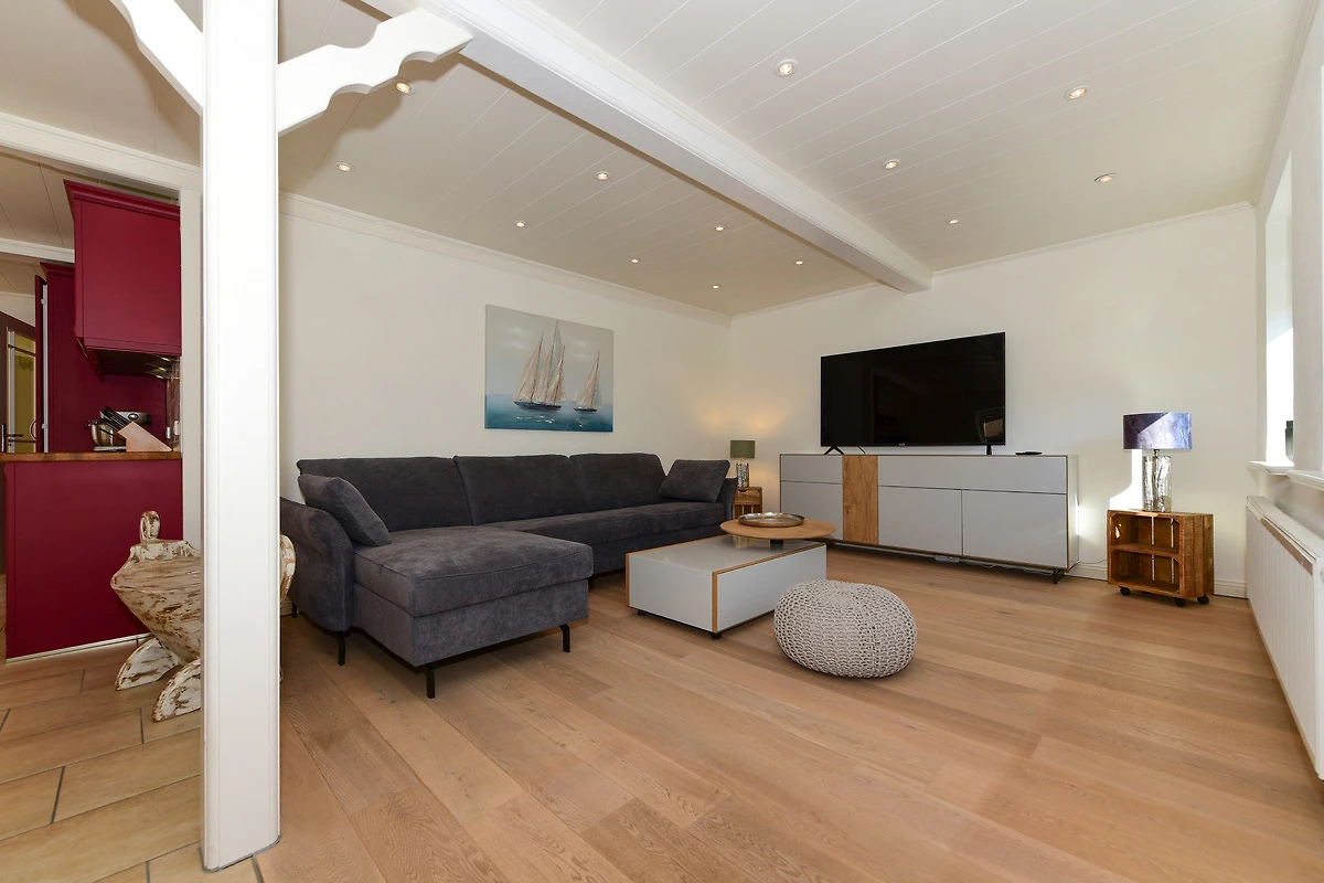 Der helle und einladende Wohnbereich bietet mit seiner gemütlichen Sofaecke und einem grossen Flachbildschirm den perfekten Ort zum Abschalten und Wohlfühlen. Am stilvollen Esstisch geniessen Sie gemeinsame Mahlzeiten oder vergnügte Spieleabende in geselliger Runde. Die angrenzende, offene und voll ausgestattete Küche erfüllt all Ihre Wünsche und rundet den Wohnbereich perfekt ab - hier können Sie sich kulinarisch austoben und das Zusammensein geniessen.