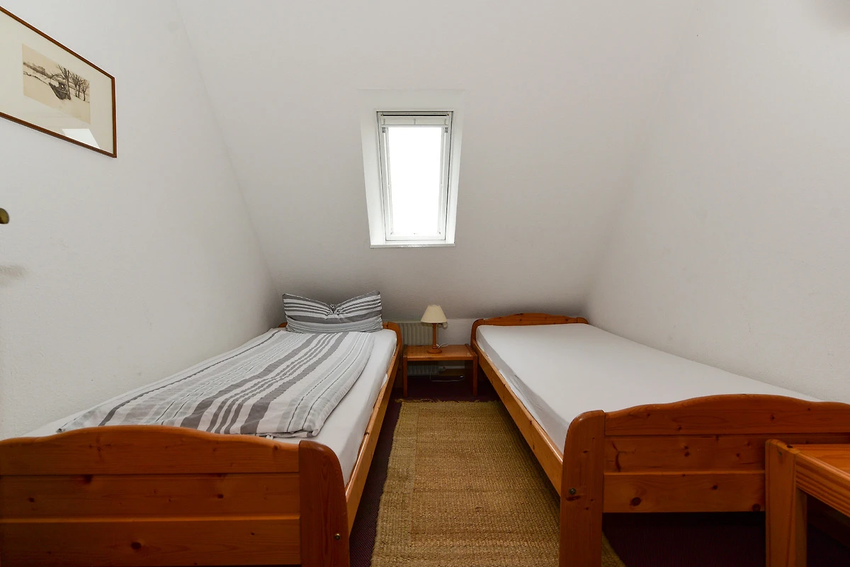 Eine offene Holztreppe führt in das Dachgeschoss, wo sich ein weiteres Schlafzimmer mit zwei Einzelbetten befindet.