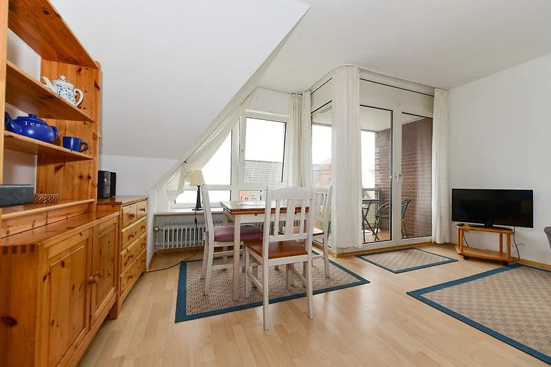 Das geräumige, lichtdurchflutete Wohnzimmer mit Balkon und teilweisem Meerblick lädt zu entspannenden Stunden ein. Das Schlafzimmer ist mit einem komfortablen Doppelbett ausgestattet und zusätzlich bietet das Wohnzimmer eine Schlafcouch.