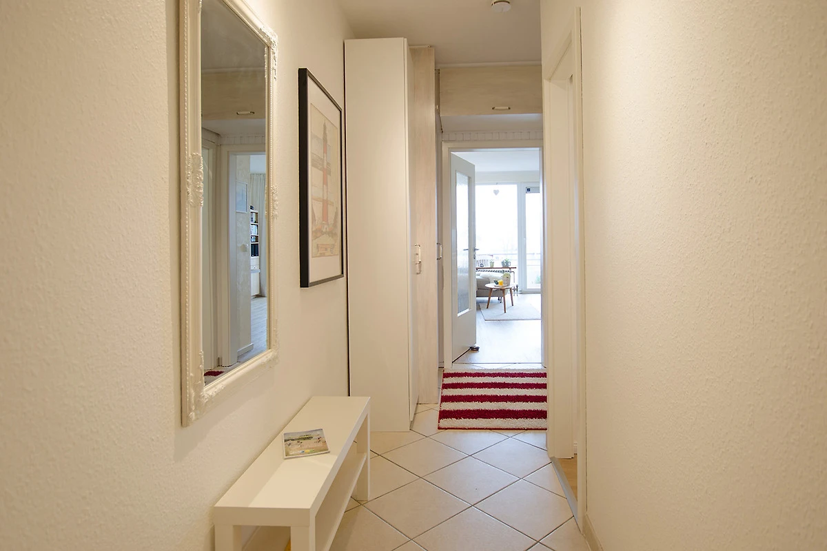 Im Flur ist ein Einbauschrank, Ganzkörperspiegel sowie eine Flurgarderobe.