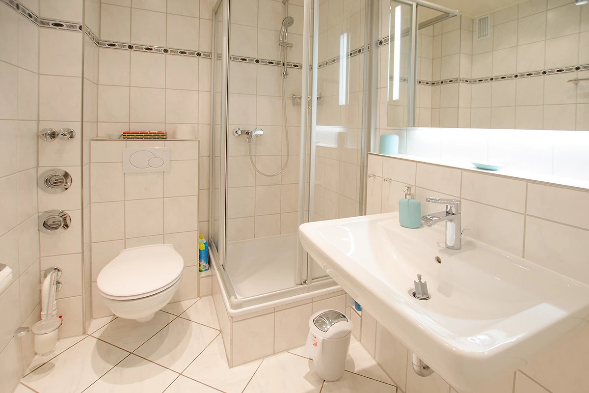 Das Badezimmer ist mit Dusche und WC ausgestattet.