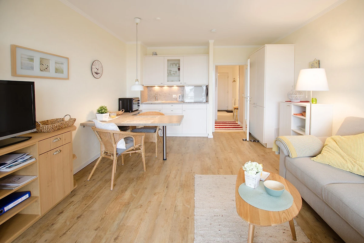 Das Wohn-Schlafzimmer der Fewo ist mit einer bequemen Schlafcouch, zwei Rattansessel, Couchtisch, TV-Regal, einem Essbereich, sowie einer integrierten Küchenzeile eingerichtet.