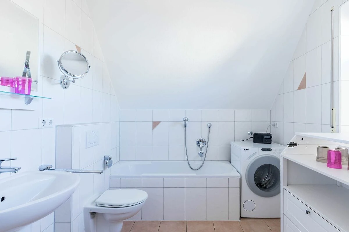 Im 1. Obergeschoss befindet sich das geräumige Badezimmer mit Waschtisch, Dusche, Badewanne, Wickeltisch und WC. Darüber hinaus gibt es hier auch eine Waschmaschine, die kostenfrei genutzt werden kann.