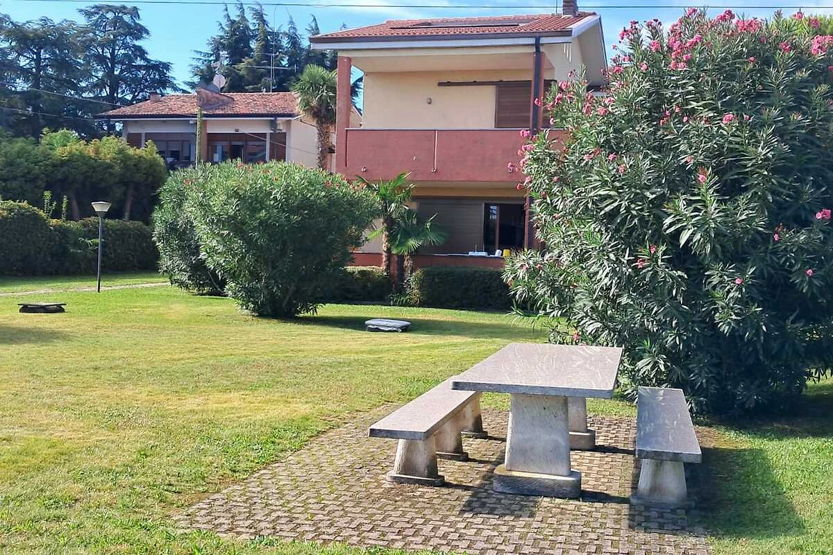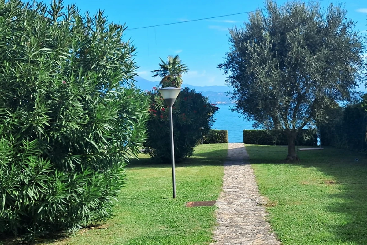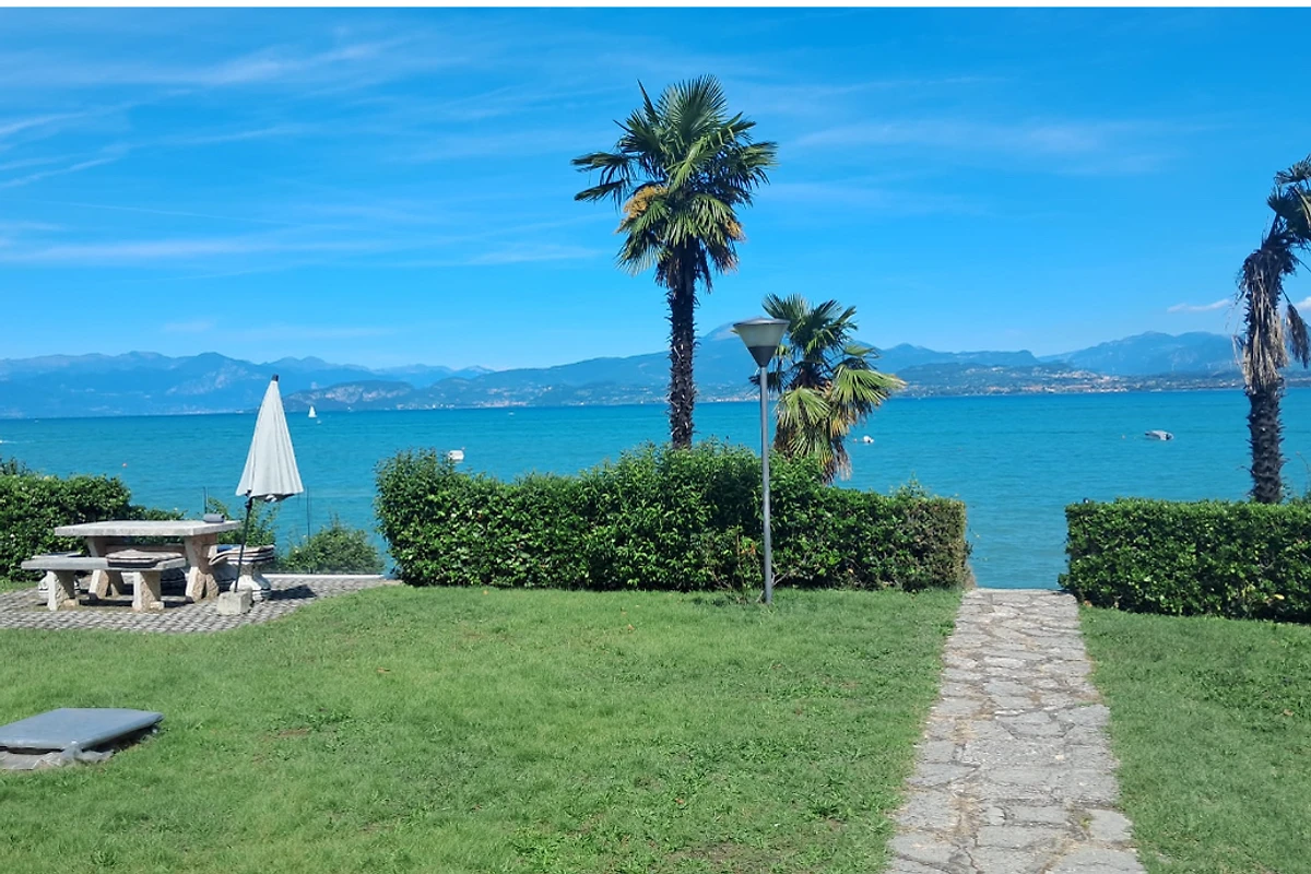 Apartment augestattet mit einem großem, Wohnzimmer Schlafzimmer und Bad in einem Reihenhaus in einer Wohnanlage direkt am Gardasee. Auf dem Foto können Sie den wunderschönen Blick auf den Garten bewundern.