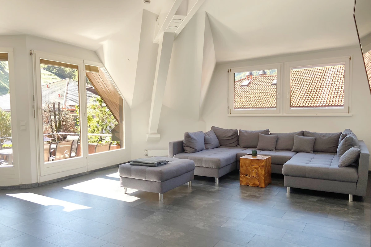 - Geräumiges Wohnzimmer mit Sofa, TV und einem gemütlichen Essbereich