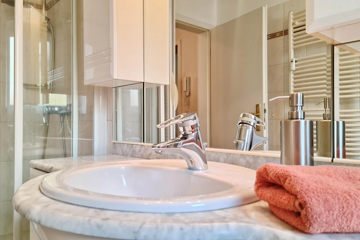 Ein Badezimmer mit Dusche und WC, Kosmetikspiegel und Haartrockner.