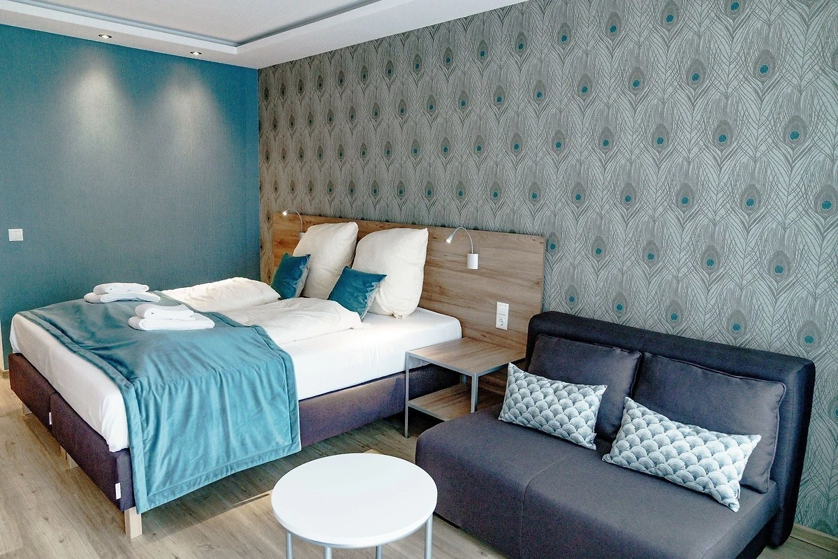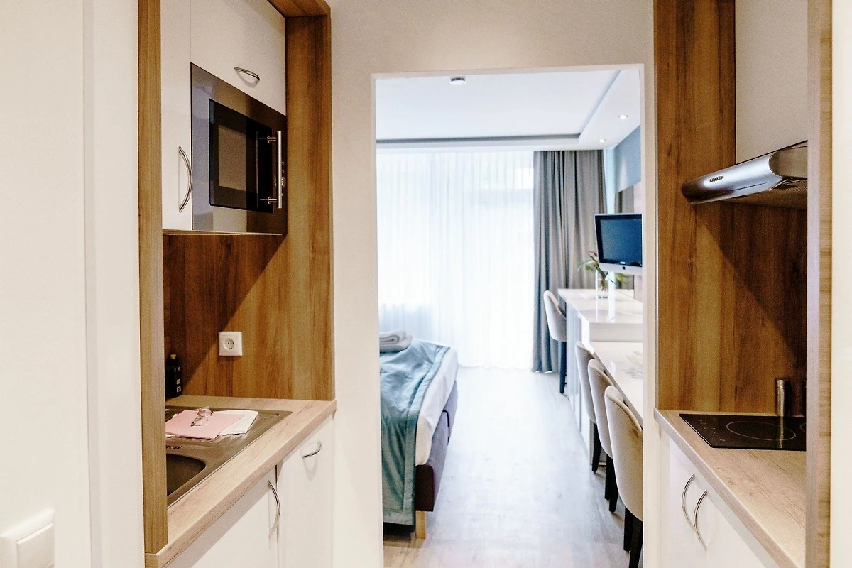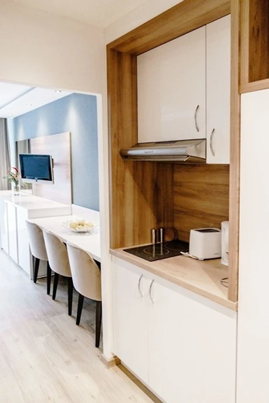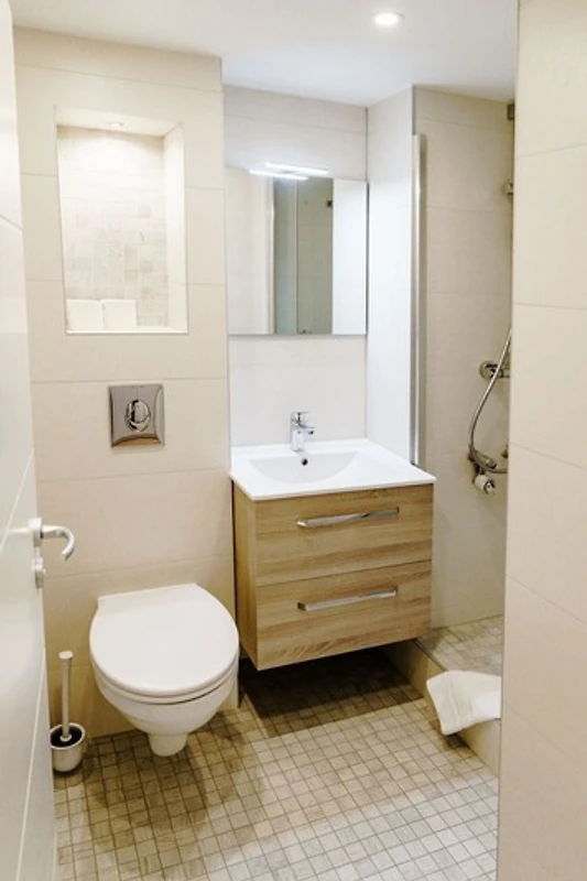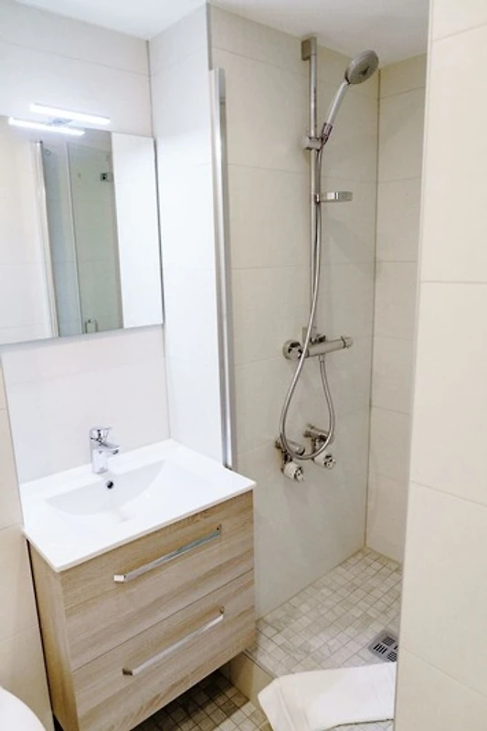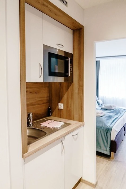 Die Ferienwohnung bietet eine komfortable Unterkunft mit einem einladenden Schlafzimmer, das mit einem Doppelbett und einem Einzelbett ausgestattet ist. Der offene Wohnbereich verfügt über ein gemütliches Sofa und einen Sessel sowie einen Esstisch, der ideal für gemeinsame Mahlzeiten ist. Eine gut ausgestattete Küchenzeile lädt dazu ein, eigene Gerichte zuzubereiten. Sie umfasst einen Elektro-/Gasherd, einen Geschirrspüler, eine Mikrowelle, einen Kühlschrank sowie Zusatzgeräte wie eine Kaffeemaschine, einen Toaster und einen Wasserkocher. Das moderne Badezimmer mit Duschbad ist mit Badetüchern und einem Haartrockner ausgestattet. Für zusätzlichen Komfort sorgen Heizung, ein Fernseher, ein Schreibtisch sowie eine Garderobe. Ein Fahrstuhl erleichtert den Zugang zur Wohnung. Internet steht ohne WLAN zur Verfügung. Diese Ferienwohnung bietet eine perfekte Kombination aus Funktionalität und Gemütlichkeit.