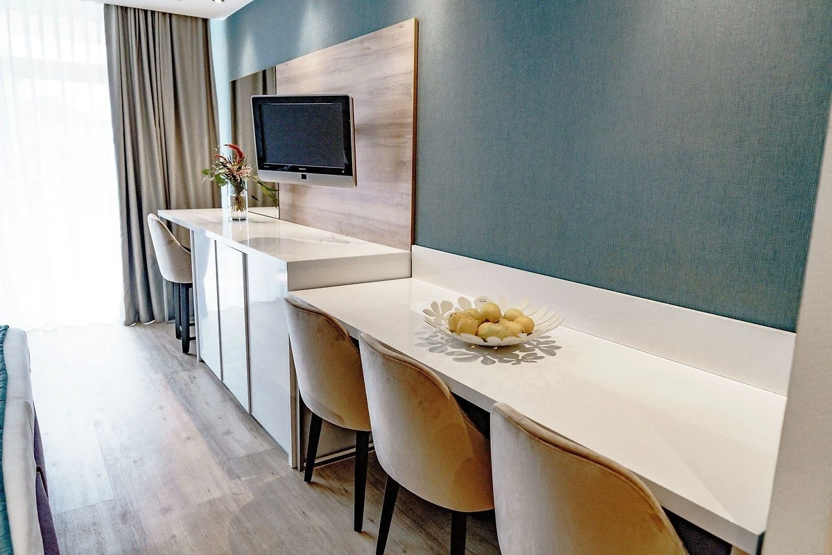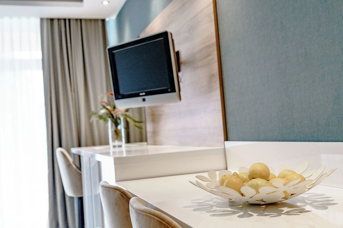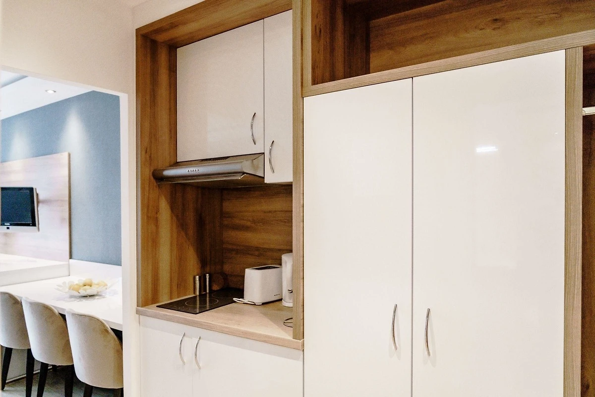 Die Ferienwohnung bietet eine komfortable Unterkunft mit einem einladenden Schlafzimmer, das mit einem Doppelbett und einem Einzelbett ausgestattet ist. Der offene Wohnbereich verfügt über ein gemütliches Sofa und einen Sessel sowie einen Esstisch, der ideal für gemeinsame Mahlzeiten ist. Eine gut ausgestattete Küchenzeile lädt dazu ein, eigene Gerichte zuzubereiten. Sie umfasst einen Elektro-/Gasherd, einen Geschirrspüler, eine Mikrowelle, einen Kühlschrank sowie Zusatzgeräte wie eine Kaffeemaschine, einen Toaster und einen Wasserkocher. Das moderne Badezimmer mit Duschbad ist mit Badetüchern und einem Haartrockner ausgestattet. Für zusätzlichen Komfort sorgen Heizung, ein Fernseher, ein Schreibtisch sowie eine Garderobe. Ein Fahrstuhl erleichtert den Zugang zur Wohnung. Internet steht ohne WLAN zur Verfügung. Diese Ferienwohnung bietet eine perfekte Kombination aus Funktionalität und Gemütlichkeit.