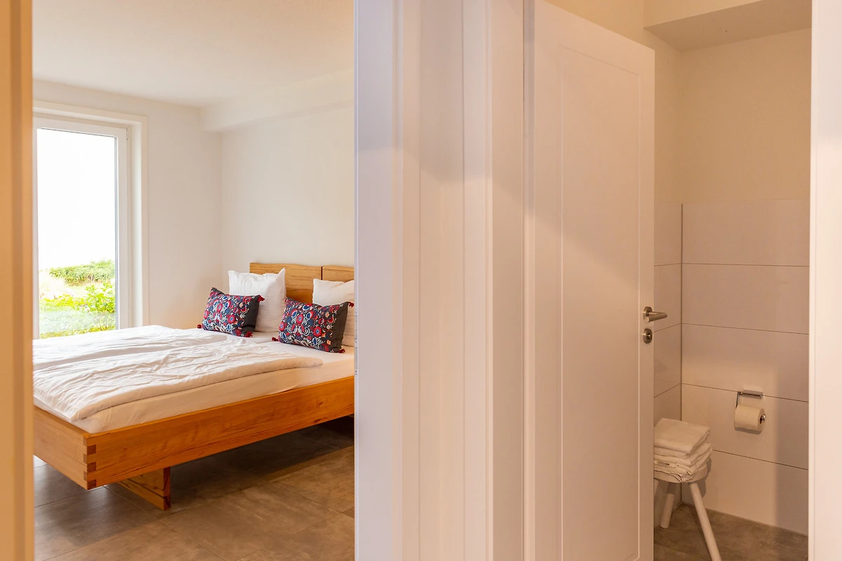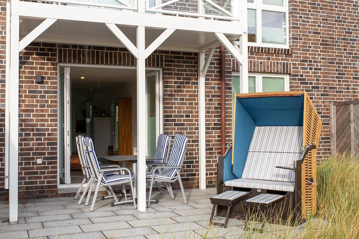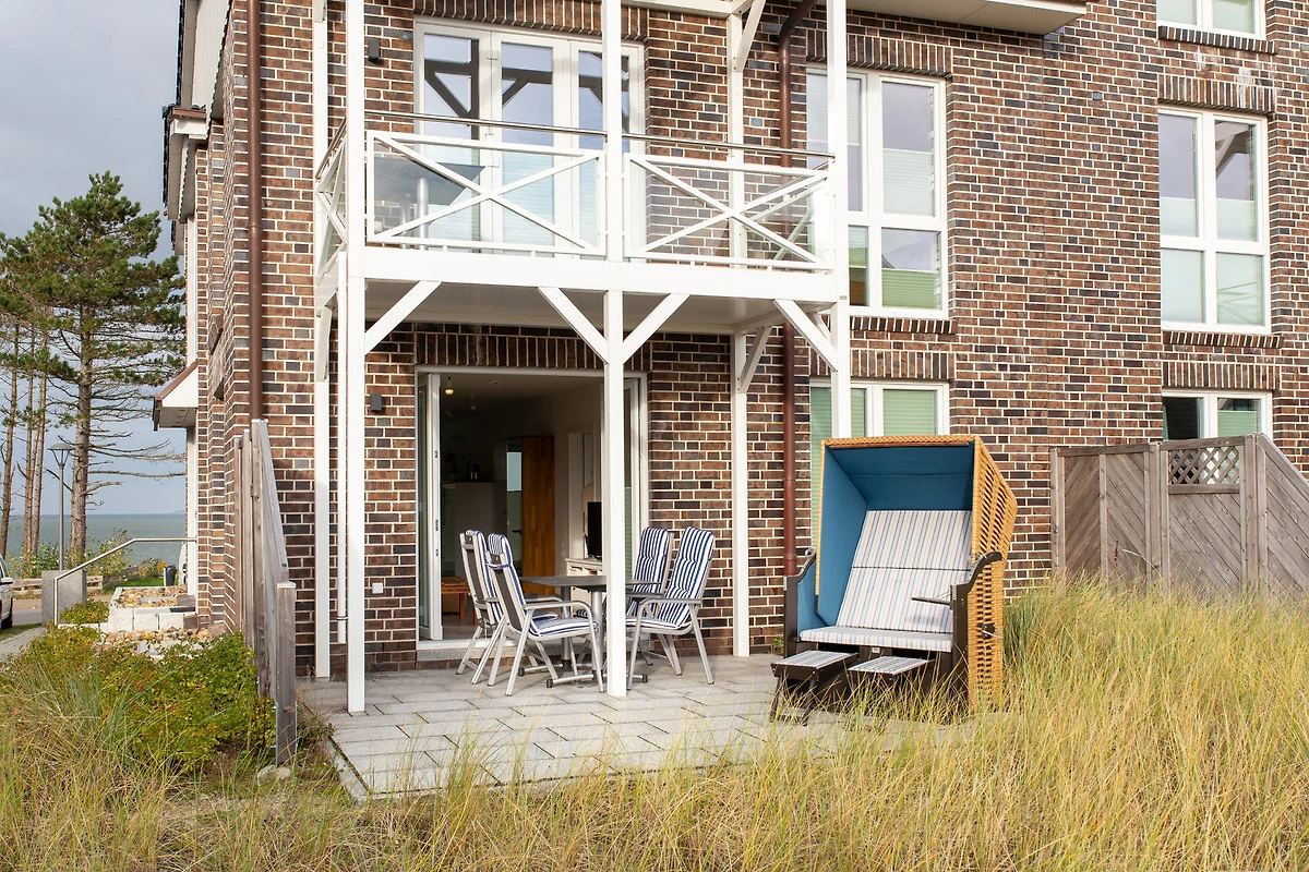 Eine nach Süden ausgerichtete Terrasse ist direkt vom Wohnzimmer aus zu erreichen. Dort finden Sie einen Strandkorb und Gartenmöbel vor. Zudem steht Ihnen auf der nördlichen Seite der Ferienwohnung ein Balkon mit Möbeln und Meerblick zur Verfügung.