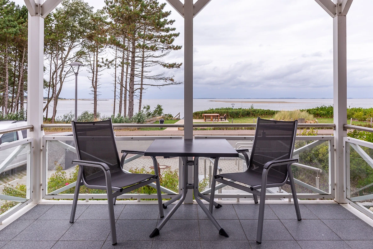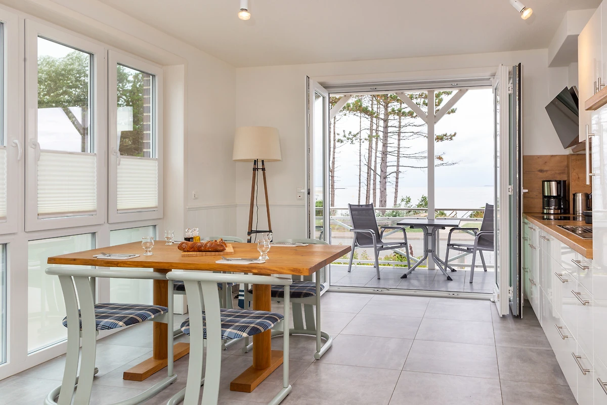Die Küche mit Essbereich und eigenem Balkon bietet einen herrlichen Blick auf das Wattenmeer und die Gezeiten. Bis nach Steenodde, Norddorf und sogar zu der Nachbarinsel Föhr reicht die unvergessliche Sicht.