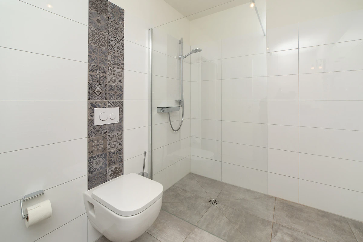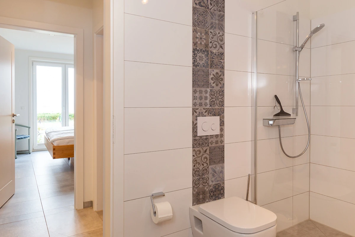 Zudem erwartet sie ein modernes Badezimmer mit ebenerdiger Dusche und WC sowie ein separates Gäste-WC.