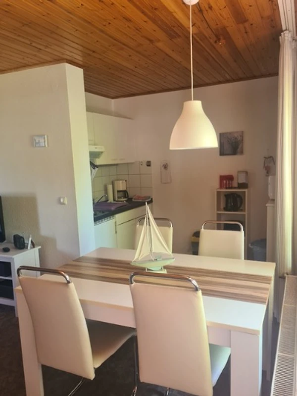 Die Wohnung bietet ein Schlafzimmer mit zwei Einzelbetten. In dem grossen Wohn- und Essbereich ist eine kleine, aber zweckmässig ausgestattete Küche, ein Esstisch und ein (Schalf-) Sofa, auf dem weitere zwei Personen schlafen können.