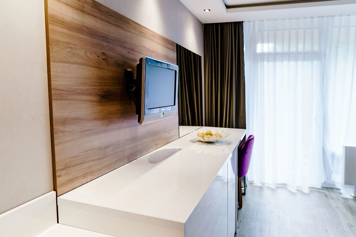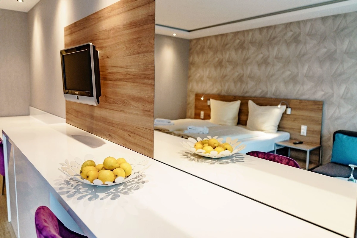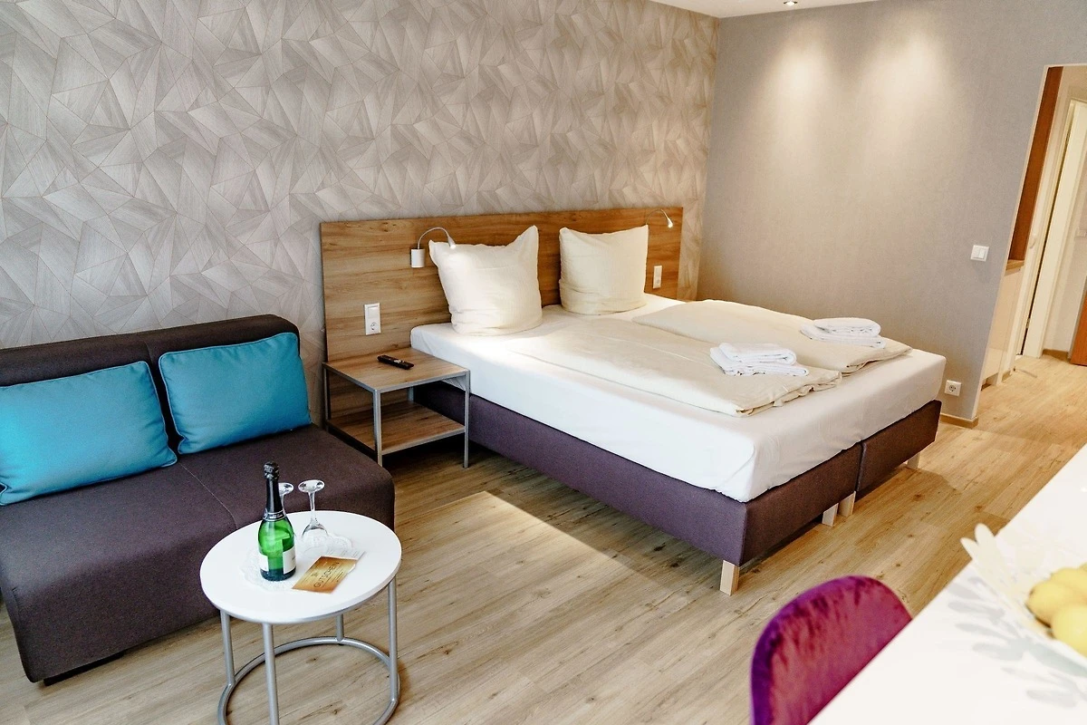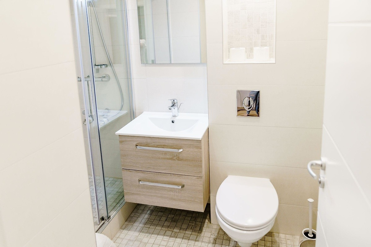 Die Ferienwohnung bietet ein einladendes Ambiente mit einem komfortablen Schlafzimmer, das mit einem Doppelbett und einem Einzelbett ausgestattet ist. Der lichtdurchflutete Wohnbereich lädt zum Entspannen ein und ist mit einem Sofa, Sessel und einem Esstisch ausgestattet. Die Küchenzeile verfügt über alle notwendigen Geräte, darunter einen Geschirrspüler, Elektro-/Gasherd, Mikrowelle, Kühlschrank und Kaffeemaschine. Für zusätzlichen Komfort sorgen der Wasserkocher, Toaster und die Gefriermöglichkeit. Das Badezimmer ist modern gestaltet und bietet eine Duschbad. Zur weiteren Ausstattung zählen ein TV, Schreibtisch, Schrank, Kommode sowie Badetücher und Geschirrtücher. Die Wohnung ist ausserdem mit einem Fahrstuhl erreichbar. Ein Rauchmelder sorgt für Sicherheit. Internet ist ebenfalls vorhanden, jedoch ohne WLAN, ideal für eine unkomplizierte Nutzung.