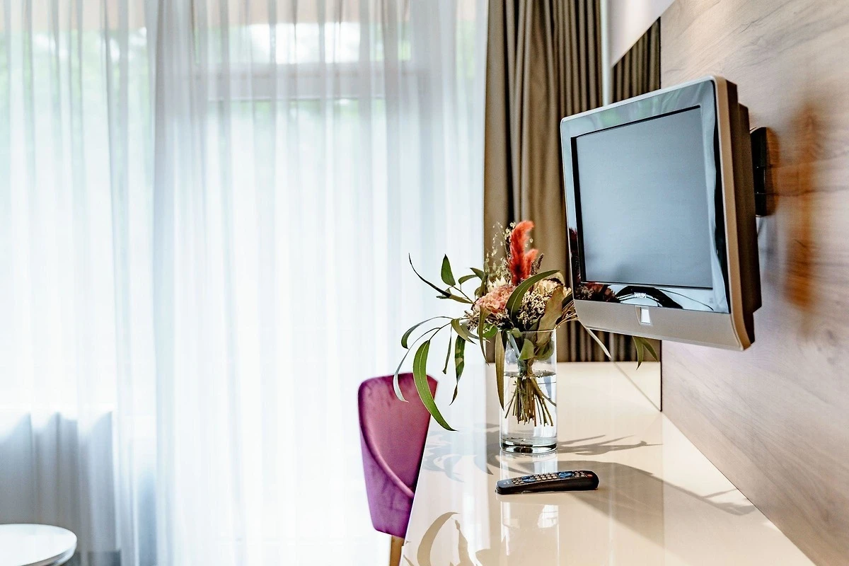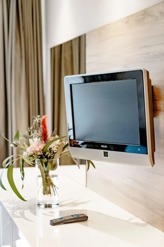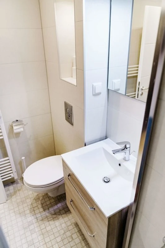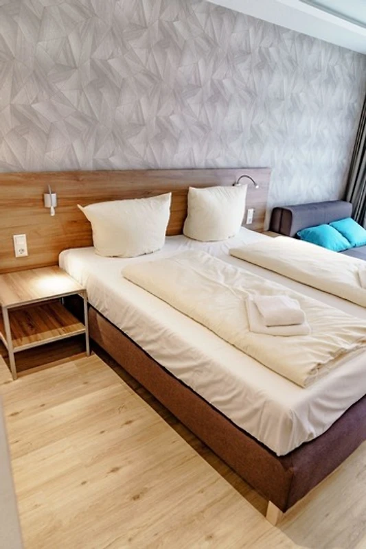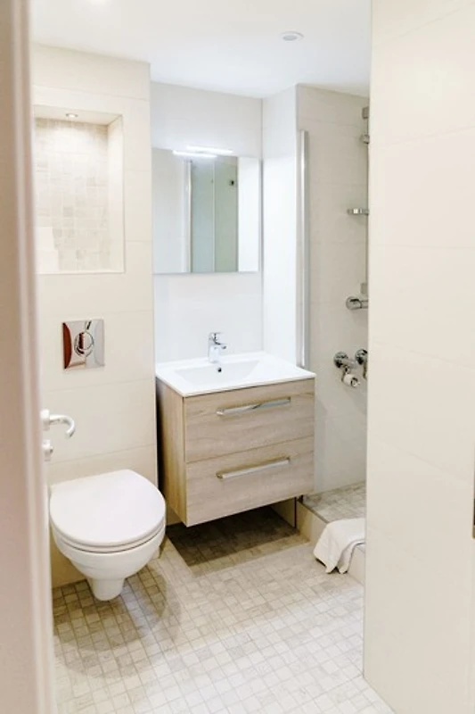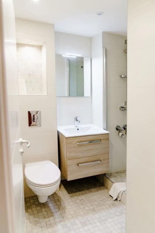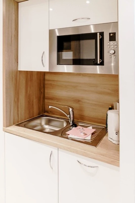 Die Ferienwohnung bietet ein komfortables Ambiente mit einem geschmackvoll eingerichteten Schlafzimmer, das mit einem Doppelbett und einem Einzelbett ausgestattet ist. Die lichtdurchfluteten Räume laden zum Entspannen ein. Eine gut ausgestattete Küchenzeile verfügt über einen Elektro-/Gasherd, Geschirrspüler, Kühlschrank, Mikrowelle, Kaffeemaschine, Toaster und Gefriermöglichkeit, was die Zubereitung von Mahlzeiten einfach macht. Der Esstisch ist ideal für gemeinsame Mahlzeiten. Das moderne Duschbad ist mit einem Haartrockner und Badetüchern ausgestattet. Zur Unterhaltung steht ein TV zur Verfügung. Die Wohnung ist durch einen Fahrstuhl erreichbar und bietet zusätzliche Annehmlichkeiten wie Geschirrtücher, Geschirr und Besteck sowie einen Schreibtisch. Die Heizung sorgt für ein angenehmes Raumklima. Sicherheit wird durch einen Rauchmelder gewährleistet. Zudem gibt es eine Garderobe für persönlichen Komfort. Diese Ferienwohnung verbindet Funktionalität mit Stil.