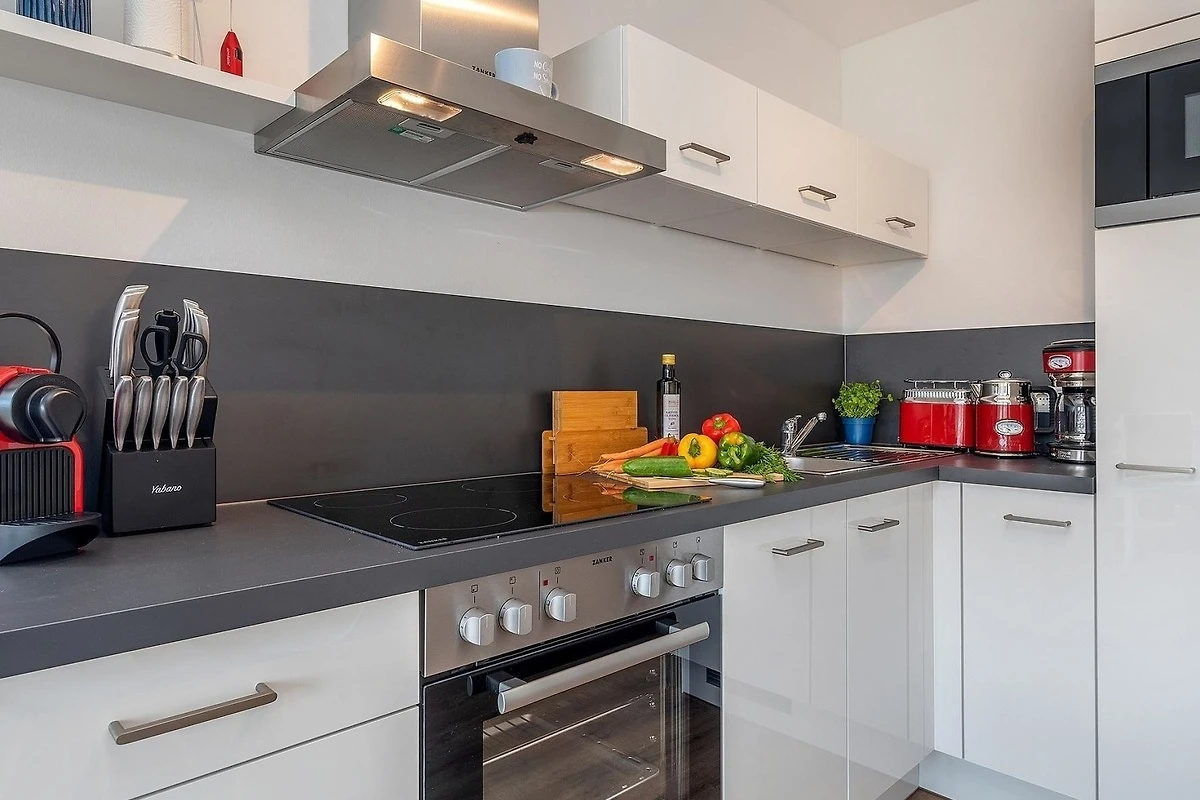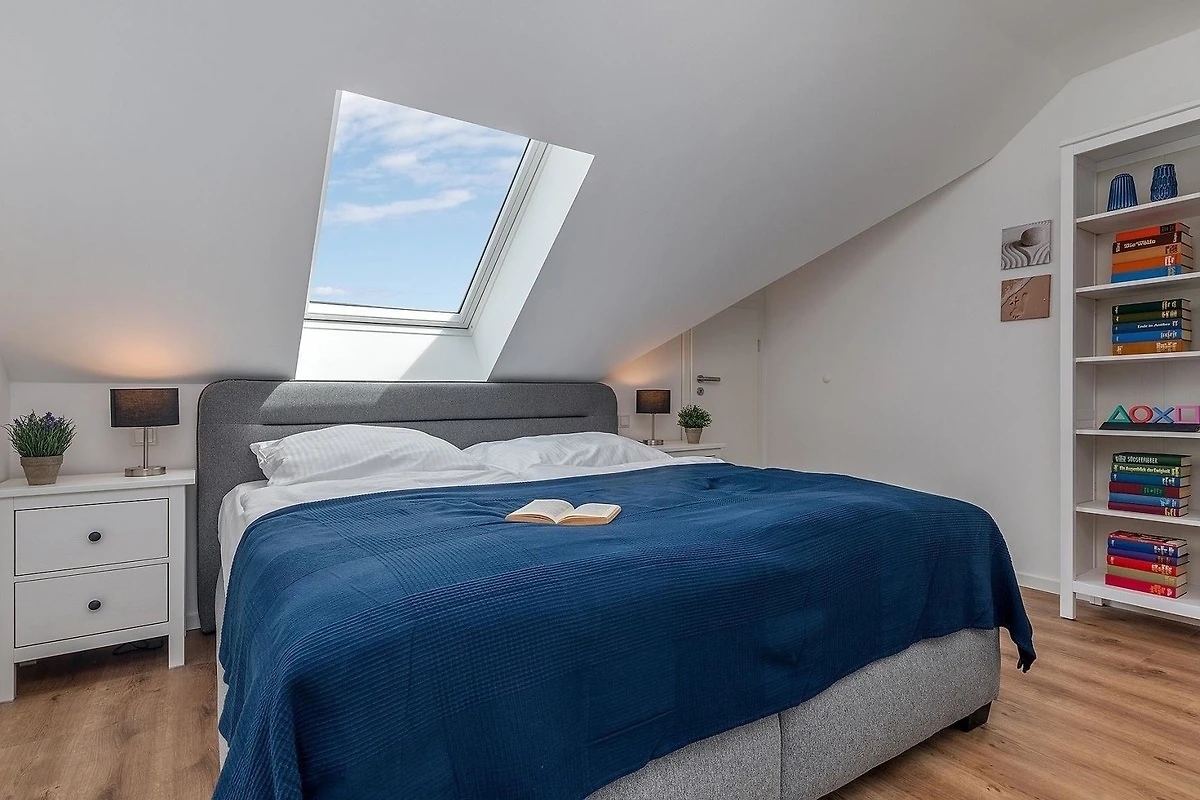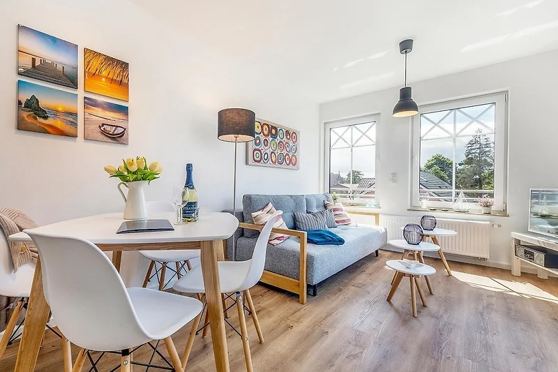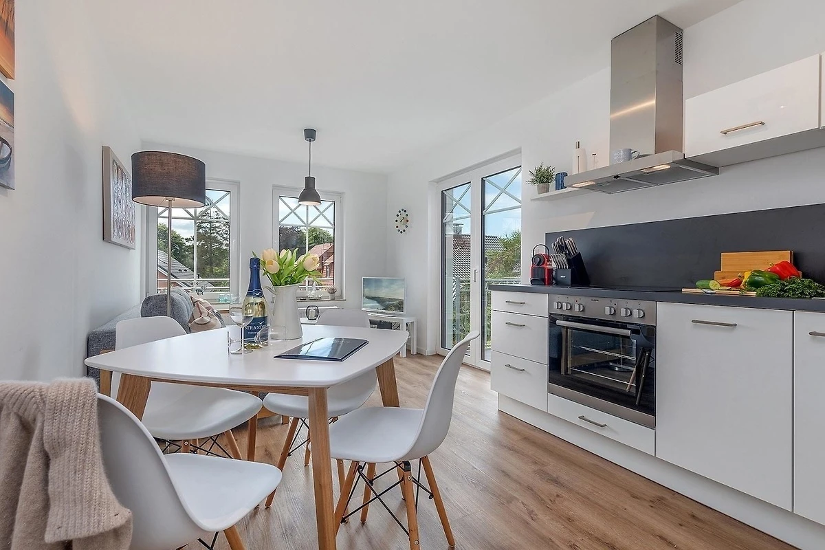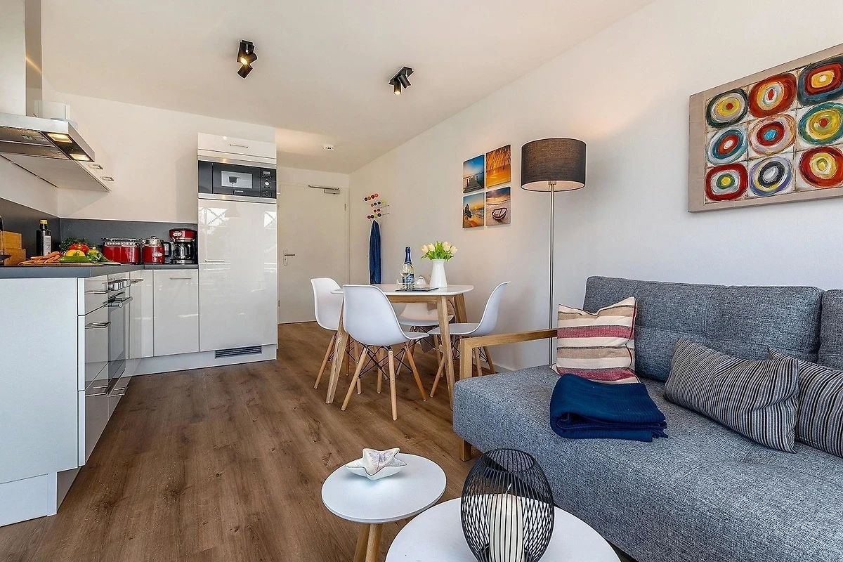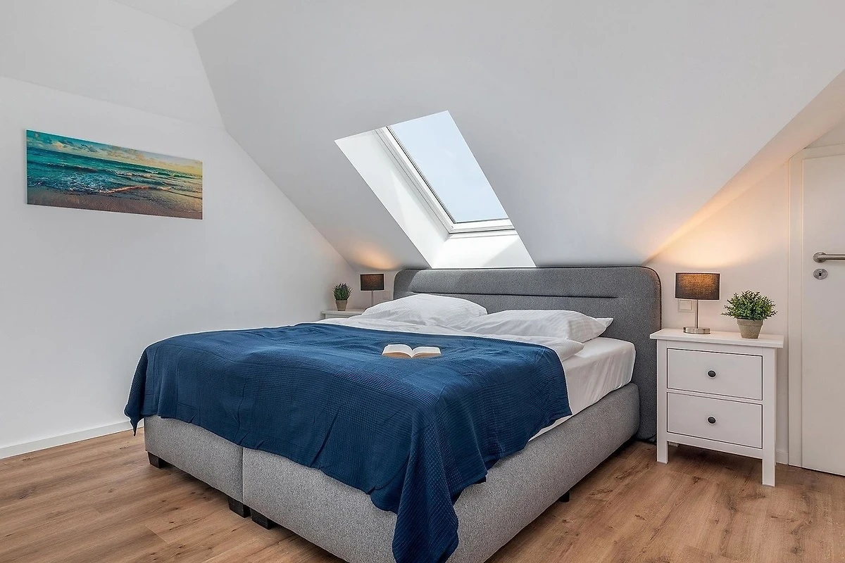Die Ferienwohnung bietet einen komfortablen Rückzugsort mit ausgezeichneter Ausstattung. Sie verfügt über ein gemütliches Schlafzimmer mit einem Doppelbett sowie ein Wohnschlafzimmer mit einer Schlafcouch, die zusätzlichen Platz für Gäste bereithält. Die offene Küche ist modern und komplett ausgestattet mit einem Geschirrspüler, Elektro-/Gasherd, Backofen, Mikrowelle und Kühlschrank. Ein zusätzlicher Gefrierschrank und eine Kaffeemaschine sorgen für den perfekten Genuss.